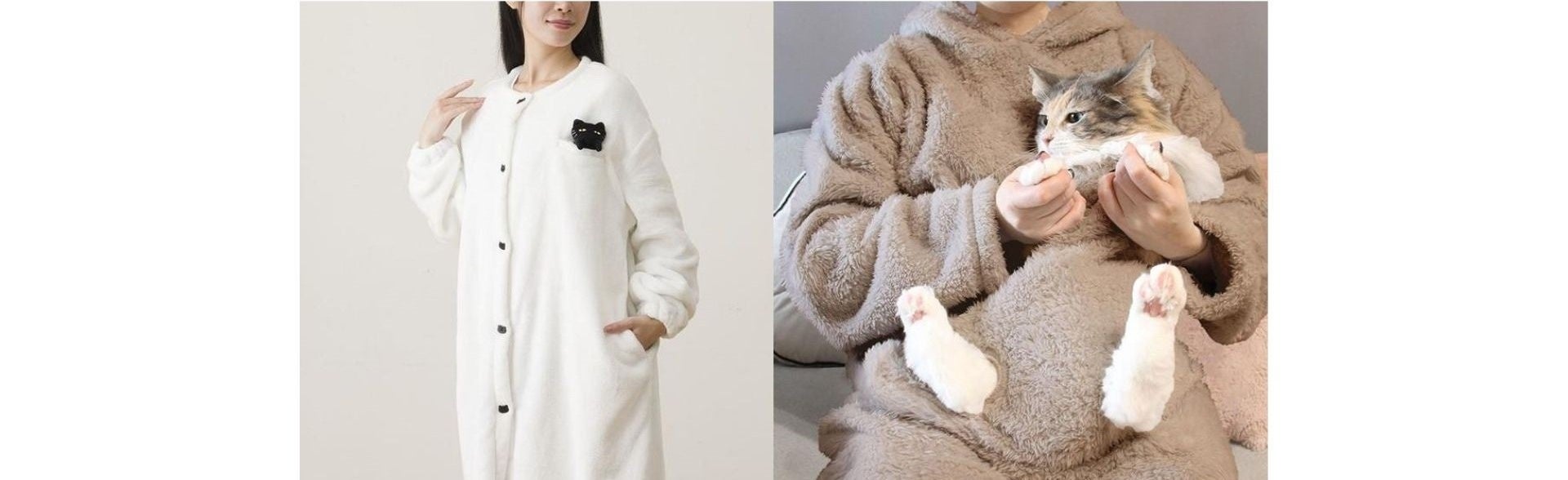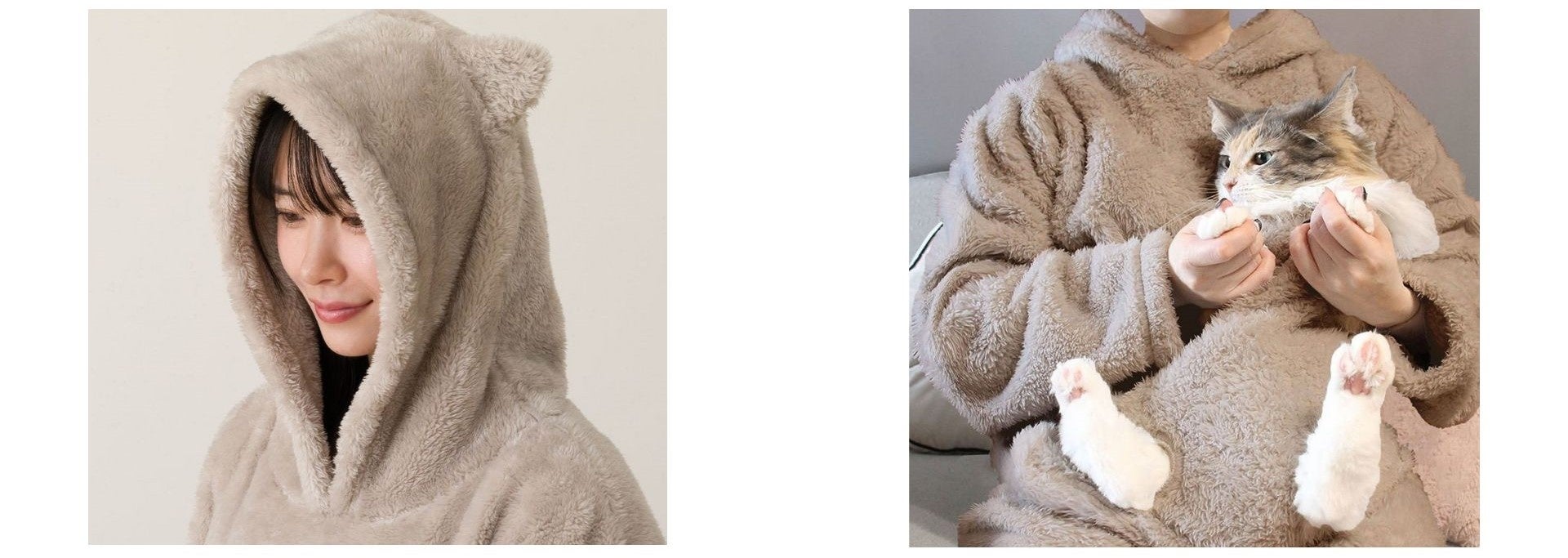 さらに、昨年ご好評いただき即完売した「ニャンポケ」着る毛布が今年も登場します!ネコが入れる大きなポケットが付いたルームウェアで、一緒にあたたまることができます。ポケットには穴があり、手足を出せば、爪切りなどのお世話もしやすい優れもの。ポケット部分はチャックで取り外しも可能なので、洗濯や収納時にも便利。シーンに合わせて、着こなしを変えることができます。猫耳付きフードもかわいいポイントです。Nウォーム素材を使用しているので、ネコといっしょに温かく過ごせます。
