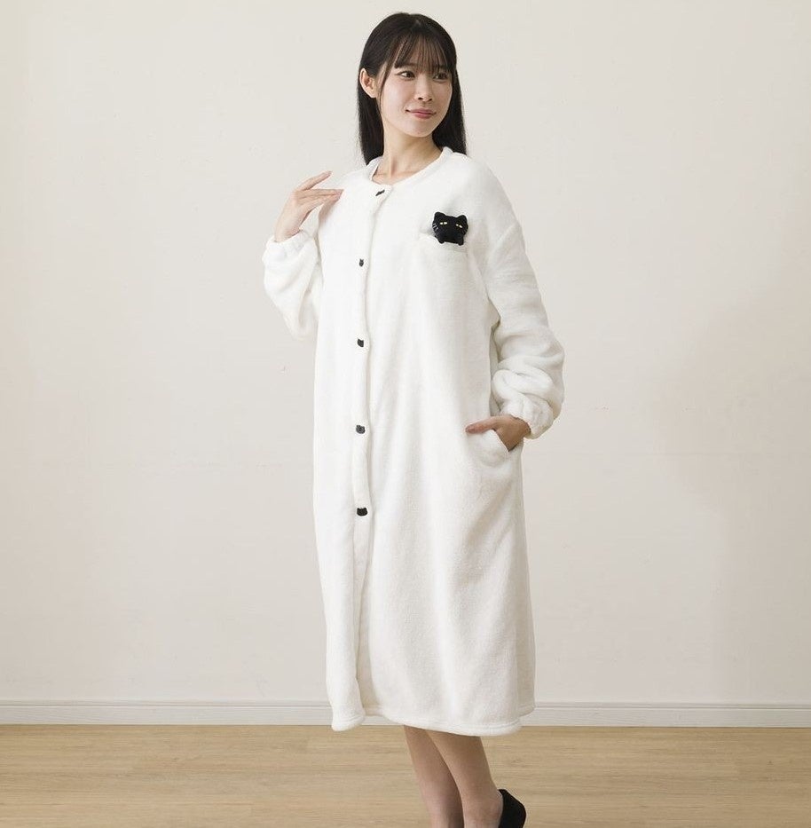 ポケットから、ちょこんとのぞくデコネコがかわいいルームウェアです。マスコットはなんと取り出し可能。手のひらに収まる、ちょうど良いサイズ感です。ボタンの形もデコネコになっており、背中側には足あとも。ゆるかわなデザインにこだわりました。