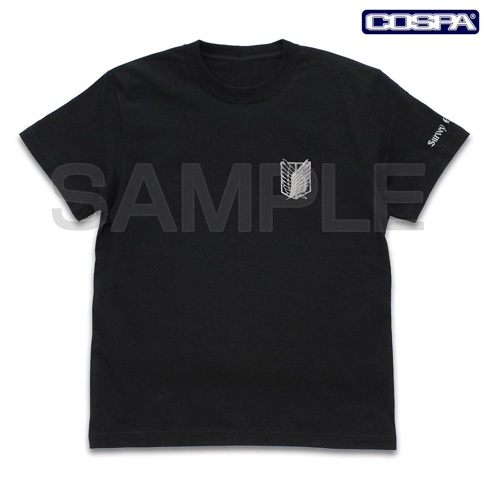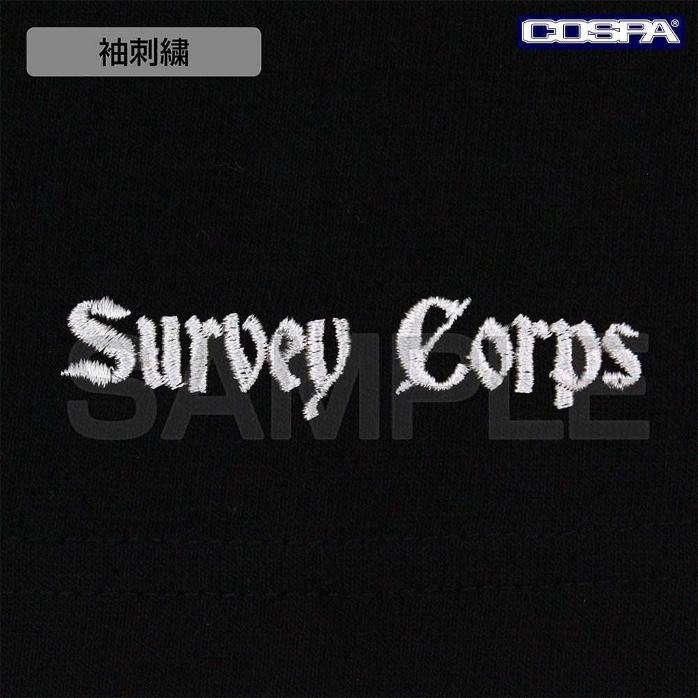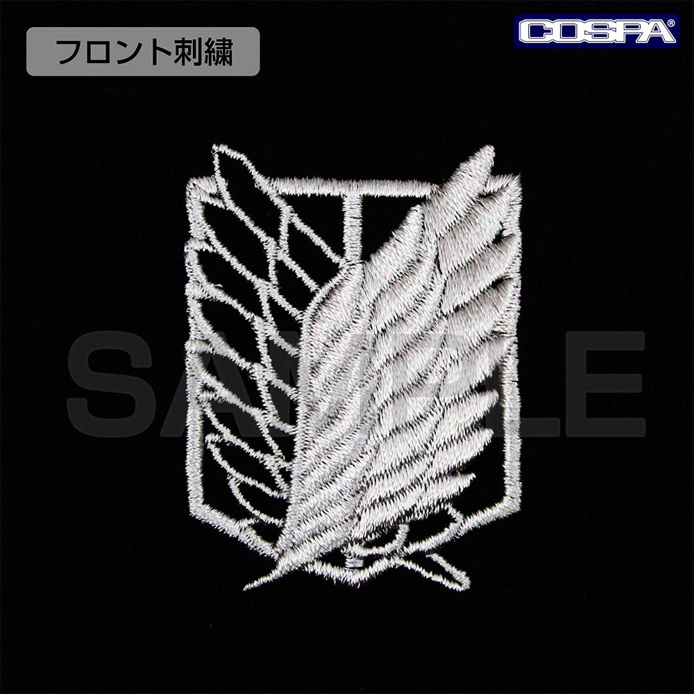 調査兵団の紋章「自由の翼」と「Survey Corps」の文字を刺繍で表現したTシャツと、