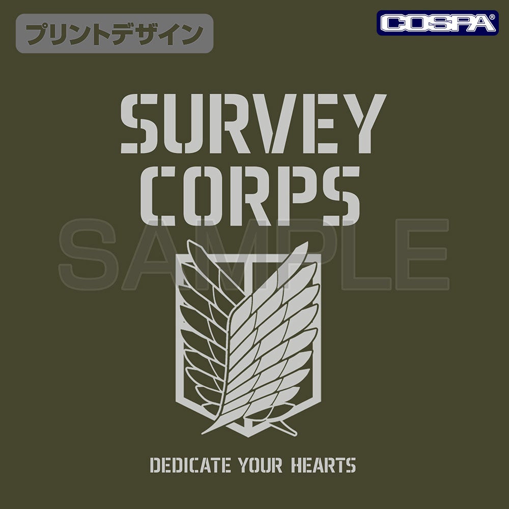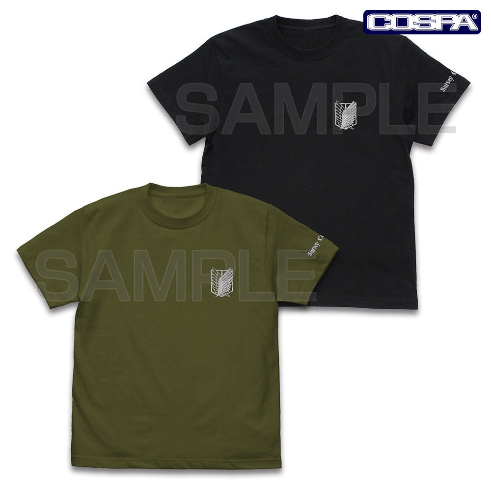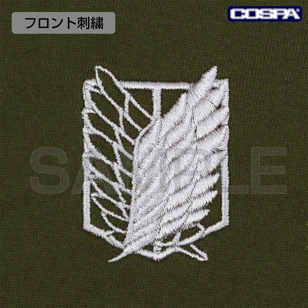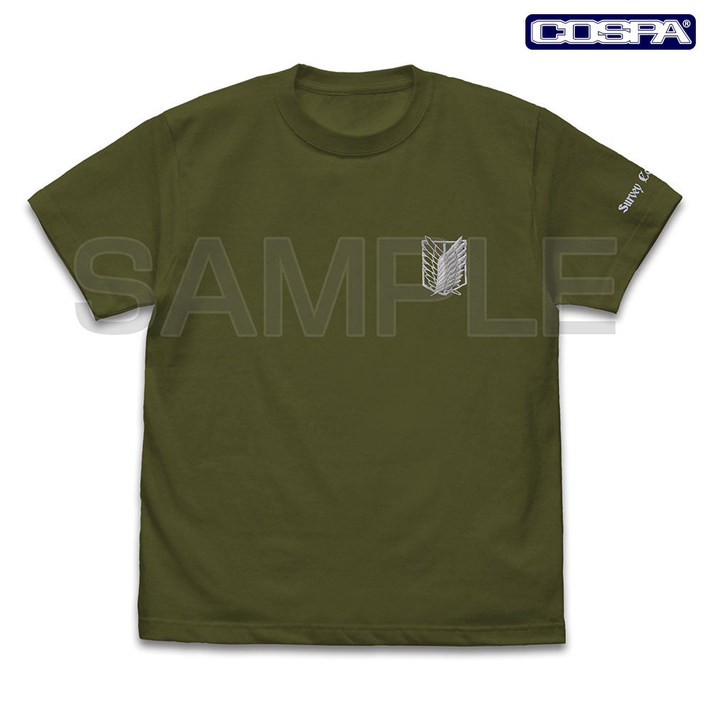 調査兵団の紋章「自由の翼」と「Survey Corps」の文字を刺繍で表現したTシャツと、