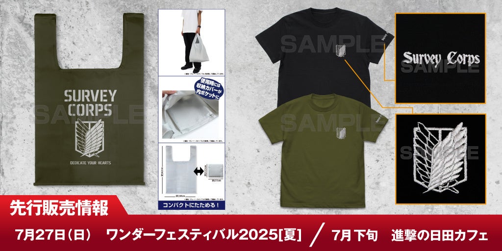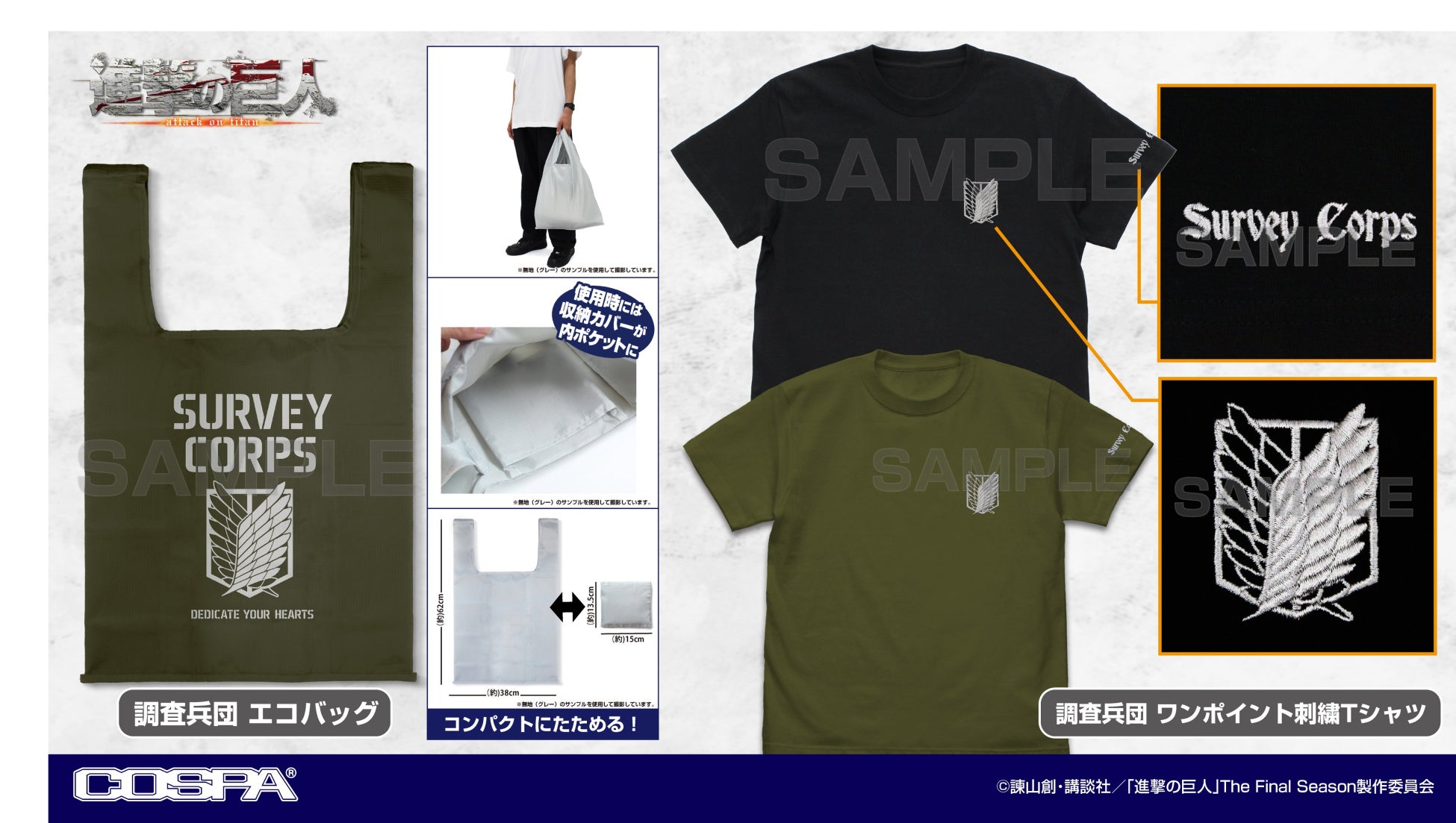 TVアニメ『進撃の巨人』より、調査兵団の紋章「自由の翼」を刺繍で表現したTシャツ、エコバッグなどが登場!〈ワンフェス〉〈進撃の日田カフェ〉で先行販売!【株式会社コスパ】