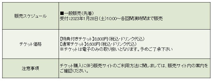 | 販売スケジュール | ■一般販売(先着) 受付:2023年1月28日(土)10:00~各回開演時間まで販売 |