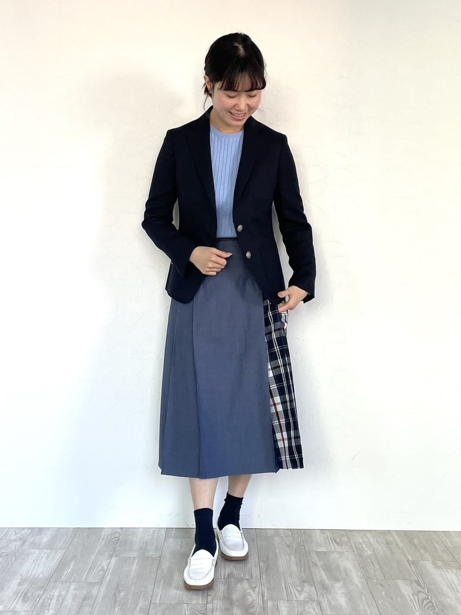 ネイビーブレザーに明るいブルートーンをプラスして、定番のトラッドスタイルをアップデート。ダンガリーとハウスタータンをドッキングした、新鮮なデザインのキルト風スカートがポイントです。トップスは爽やかなサックスブルーのニットをチョイス。ジャケットの堅い印象を抑え、春らしさを感じさせる着こなしです。