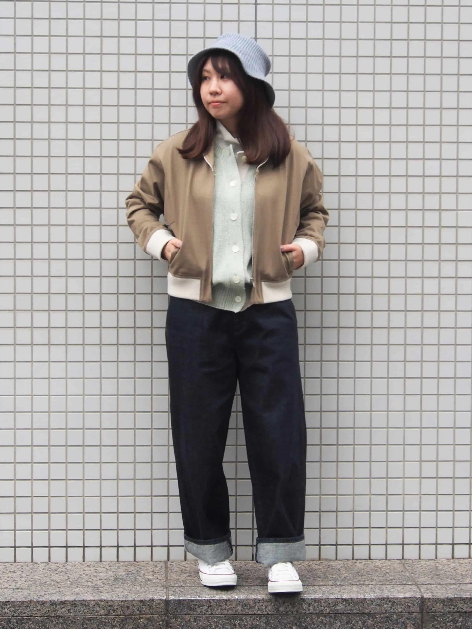 春が近づくと気になるアイテムといえば、デイリーに着回せるデニム。カーキグリーンのブルゾンを合わせて、マニッシュに着こなしました。インナーやハットは淡い発色のニット素材を選び、春らしいムードもプラス。ナチュラルな表情のあるデニムのネイビーは、スタイリングを引き締めつつ淡い色にも馴染んでくれます。