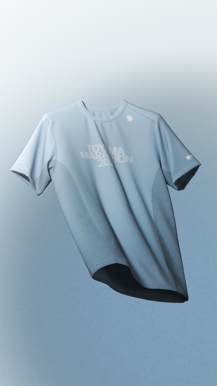 富山県小矢部市にある当社の研究開発施設「ゴールドウイン テック・ラボ」が算出した、ランニング時における日射と発汗のヒートマップデータを活用した今年度の参加賞Tシャツ。日射が強く当たる身頃上部から肩回りにかけてはUVカット機能を持つ素材、発汗量の多い袖下から背面にかけては通気性の高いドットメッシュを使用し、快適な着心地を実現しました。裏面の一部には、廃材を再利用したリサイクルポリエステル繊維「Cycora®」(※1)を採用しています。テキスタイル廃棄物100%で作られた高品質な再生ポリエステルで、環境負荷を低減しつつ、品質や機能性を両立し、循環型社会の実現を目指します。カラーはブルーを基調とし、リフレクター機能を持つ再帰反射プリントで富山マラソンのグラフィックを表現。マラソン大会当日はもちろん、普段のランニングや汗ばむ季節のアクティブウエアとしても、幅広くご活用いただけます。