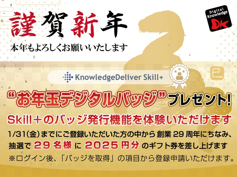 新春お年玉デジタルバッジは、株式会社デジタル・ナレッジが提供するデジタルバッジソリューションのスキルマネジメントシステム「KnowledgeDeliverSkill+」を利用しています。