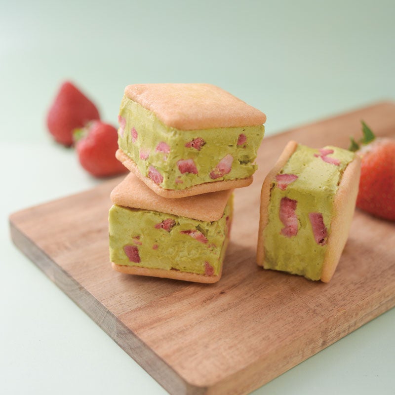 イタリア産のピスタチオペーストを混ぜ込んだバタークリームに、フリーズドライの苺を混ぜ込んだ香り高いバターサンド。- 牧場系、フルーツ系などカップタイプからバータイプ、コーンアイスまで