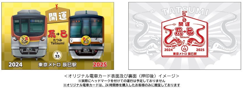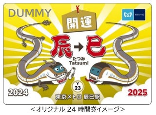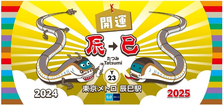東京地下鉄株式会社(本社:東京都台東区、代表取締役社長:山村 明義、以下「東京メトロ」)は、2024年の「辰」年から2025年の「巳」年に移り変わる時節を記念し、干支の名が駅名になっている有楽町線「辰巳」駅にちなんだ「辰年から巳年へ」東京メトロオリジナル24時間券(以下「オリジナル24時間券」)を発売します。また、当オリジナル24時間券をご購入いただいた方に、オリジナル電車カードを贈呈するとともに、辰巳駅にて記念フォトスポット・記念スタンプを設置いたします。