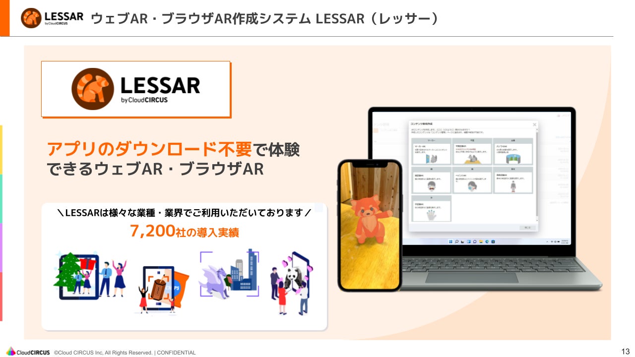 簡単にWebAR(ブラウザAR)を作成できるサービス。企業は作成したARをイベント企画や商品の宣伝に活用し、施策後はARの体験ログを分析することで改善点を見つけ、継続的にプロモーションの質を高めていくことが可能。ユーザーはアプリをインストールせずに、ウェブページやSNSのリンク(URL)またはQRコードからスマートフォンのカメラを立ち上げるだけでARを体験可能です。 ARフォトフレームやARスタンプラリー、AR×くじ引きやECサイトの試し置きなど活用方法は無限!