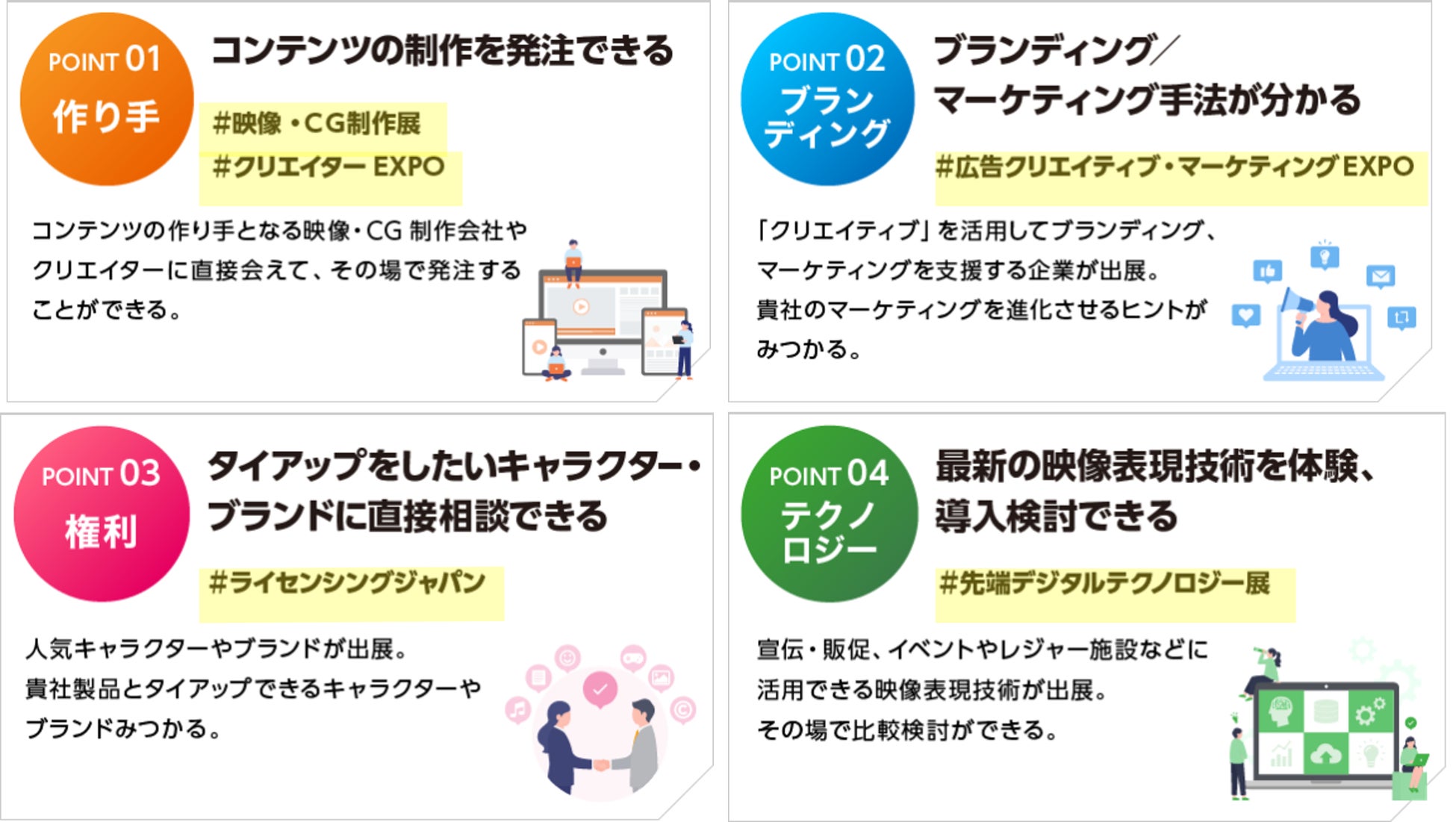 コンテンツ制作、権利、マーケティング、ブランディング、最先端デジタルテクノロジーなど、コンテンツビジネスに関するあらゆるサービス・製品が出展します。先端デバイスなども多数出展。お見逃しなく、本展でご取材ください。