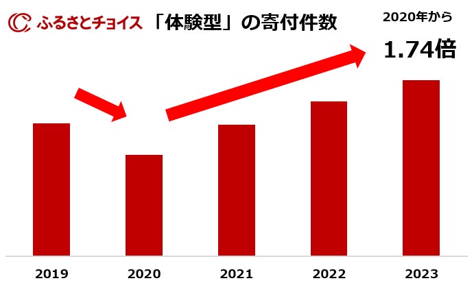 ふるさと納税のお礼の品というと、肉やフルーツなど「モノ」をもらうというイメージが強くありましたが、近年では、宿泊体験や移住体験、食の体験、アクティビティ体験、地域でのイベント参加体験など、「コト(体験)」をもらえる「体験型」のお礼の品への注目が高まっており、ふるさとチョイスでも約4万点以上が掲載されています(4月16日時点)。また、コロナ禍の影響を受け一時減少したものの、「体験型」のお礼の品への寄付は寄付件数、寄付金額ともに2021年以降、年々増加しており、各地域でも「体験型」のお礼の品のラインナップを拡充しています。