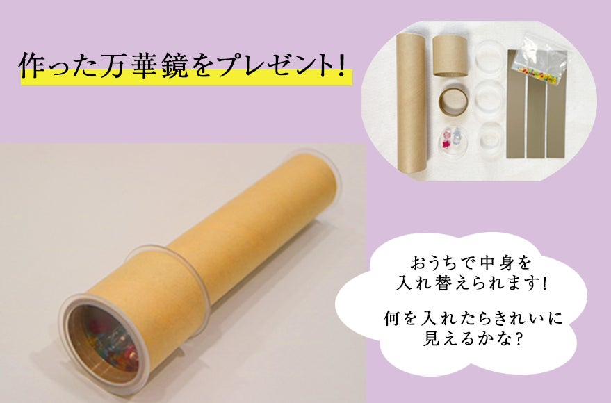 今回、ご自分で作った万華鏡をお持ち帰りいただけます。この万華鏡は、中身を入れ替えて楽しむことができます。ビーズのほかに何を入れたらきれいに見えるか考え、試してみましょう。おうちの方と一緒に、楽しみながら自分だけの万華鏡を作ってみてください。
