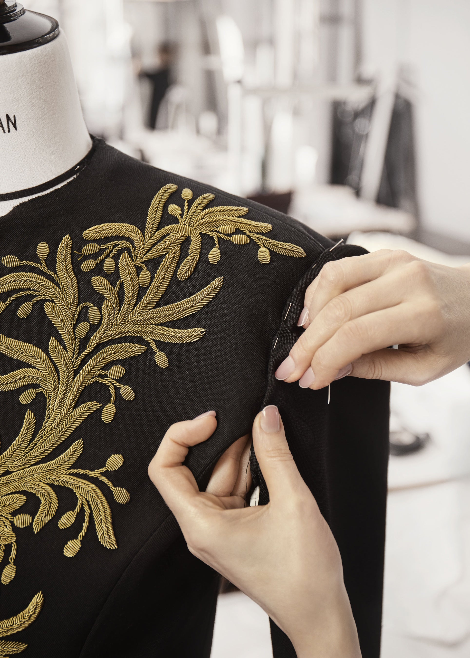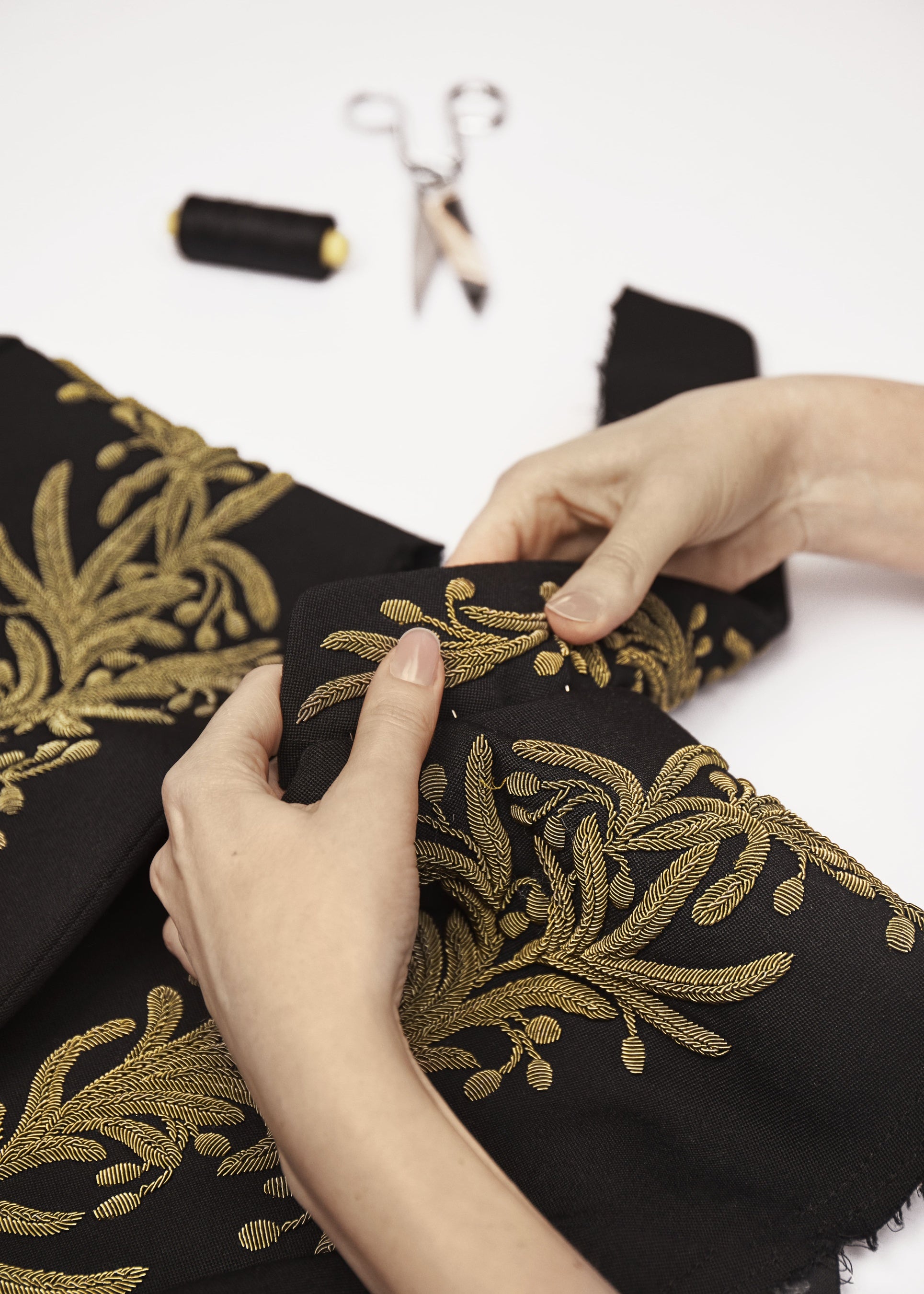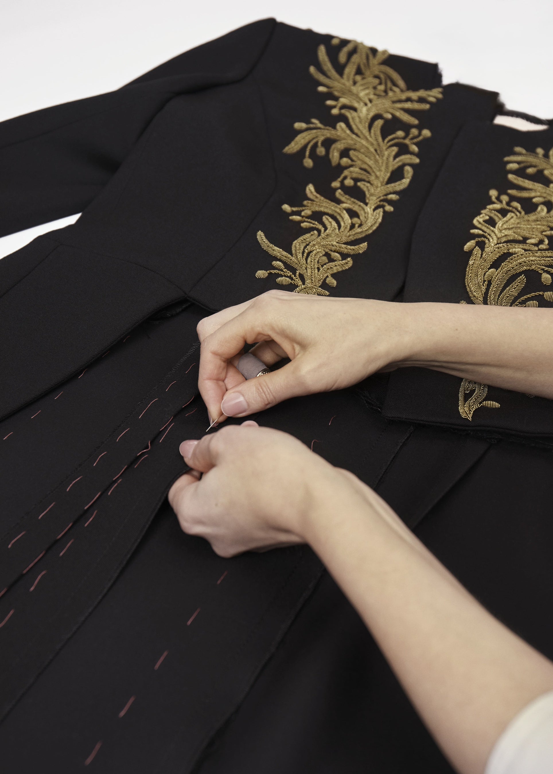 刺繍はすべて手作業で施され、真鍮の色味を想わせる単色使いのオリーブの葉が、襟元やジャケットの前身頃、袖にシンメトリーに広がっています。