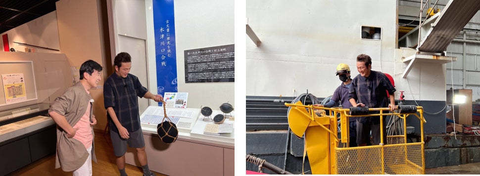 ○中村獅童さんの体当たりレポートもみどころの一つです。村上海賊の陣羽織を羽織って行う潮流体験の他、造船所での船の洗浄、高所作業クレーンに乗って船の大きさを体感するなど、盛りだくさんの内容になっています。