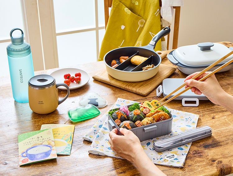 ランチボックスや保冷ランチトートなどのお弁当グッズに加え、今話題の「3品同時におかずが作れるフライパン」や時短調理グッズなどを約200種類ラインナップ。