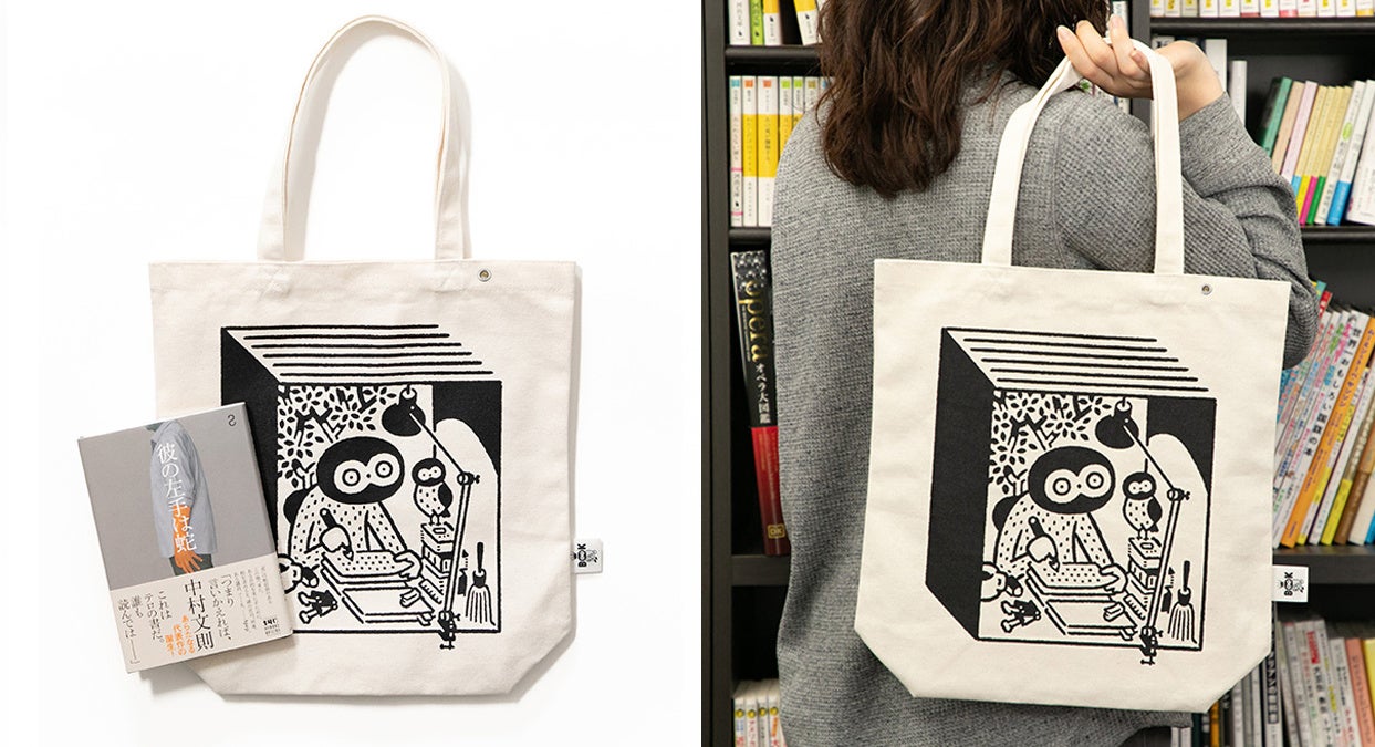 「本を入れ、街に出よう!」と声高に唱えつつ、サブバッグとして最適なトートバッグをつくりました。こちらの絵も寄藤文平さんによる描き下ろし。「ふくろうさん」が必死にゲラと向かい合っています。