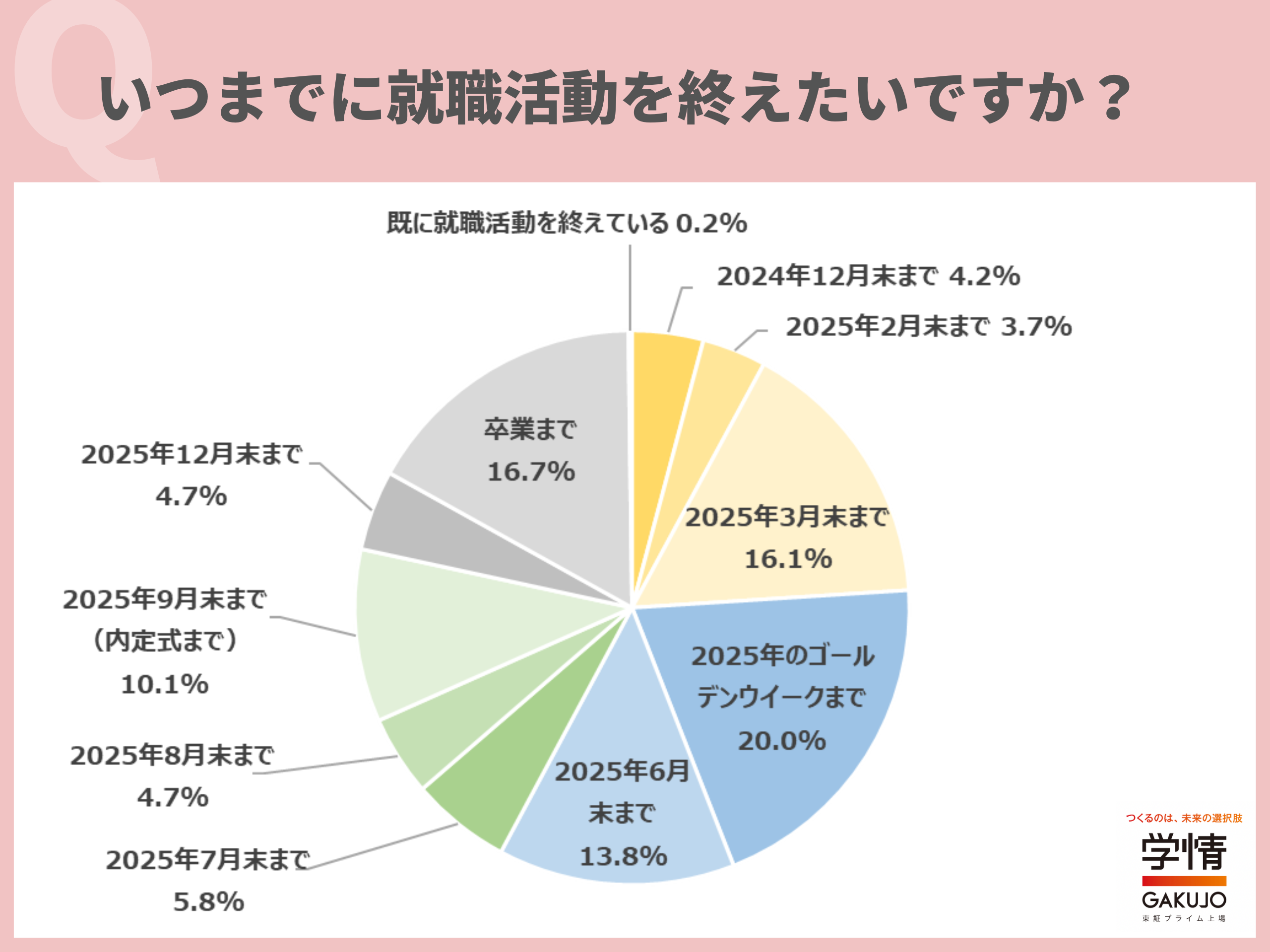 就職活動を終えたい時期は、「2025年のゴールデンウイークまで」が20.0%で最多となりました。「2024年12月末まで」4.2%、「2025年2月末まで」3.7%、「2025年3月末まで」16.1%となっており、4人に1人は、3年生のうちに就職活動を終えたいとしています。「大学2年生のときから就職活動準備をしているので、3年生のうちに内定を得たい」「3年生のうちに就職活動を終え、4年生は卒論や社会人になるための準備に時間を使いたい」「希望する業界・企業の選考が早いので、3年生のうちに就職活動を終えるイメージをしている」「インターンシップに参加した企業の中から選考に参加する企業を決め、早期選考で内定を得たい」といった声が上がっています。