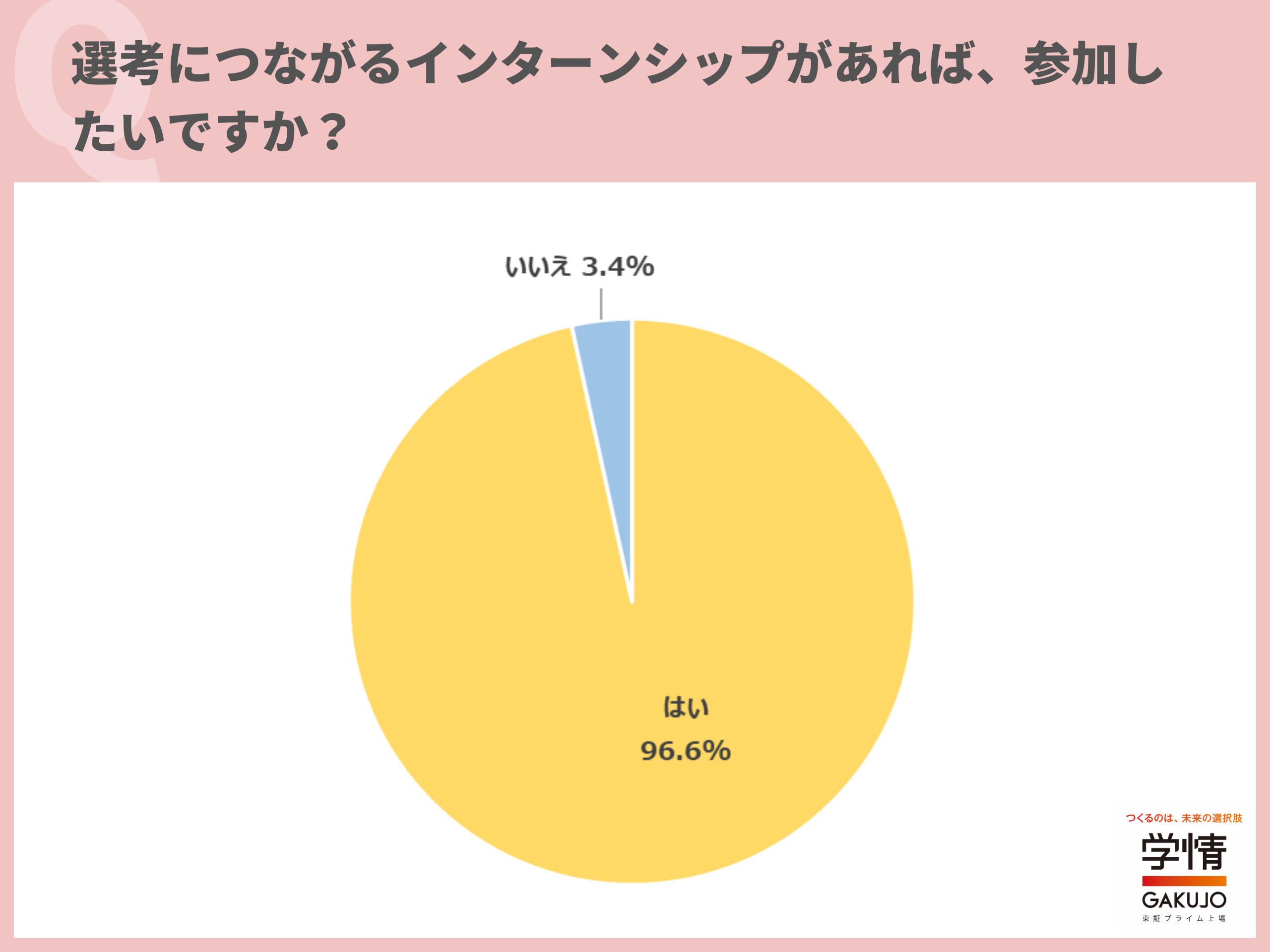 選考につながるインターンシップに、「参加したい」と回答した学生が96.6%に上りました。「インターンシップに参加し、具体的に仕事をイメージできた企業の選考に参加したい」「3年生のうちに内定を得たい」「インターンシップは就職活動を有利に進めるために参加するので、選考に直結すると嬉しい」といった声が上がりました。