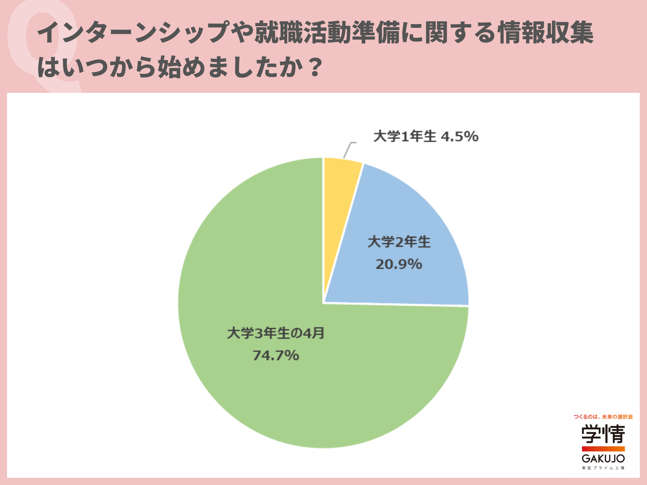 インターンシップや就職活動準備に関する情報収集を始めた時期について、「大学1年生」のときと回答した学生は4.5%でした。「大学2年生」の回答は20.9%で、4人に1人は「大学1・2年生」のときからインターンシップや就職活動準備に関する情報収集をしていることが分かります。
