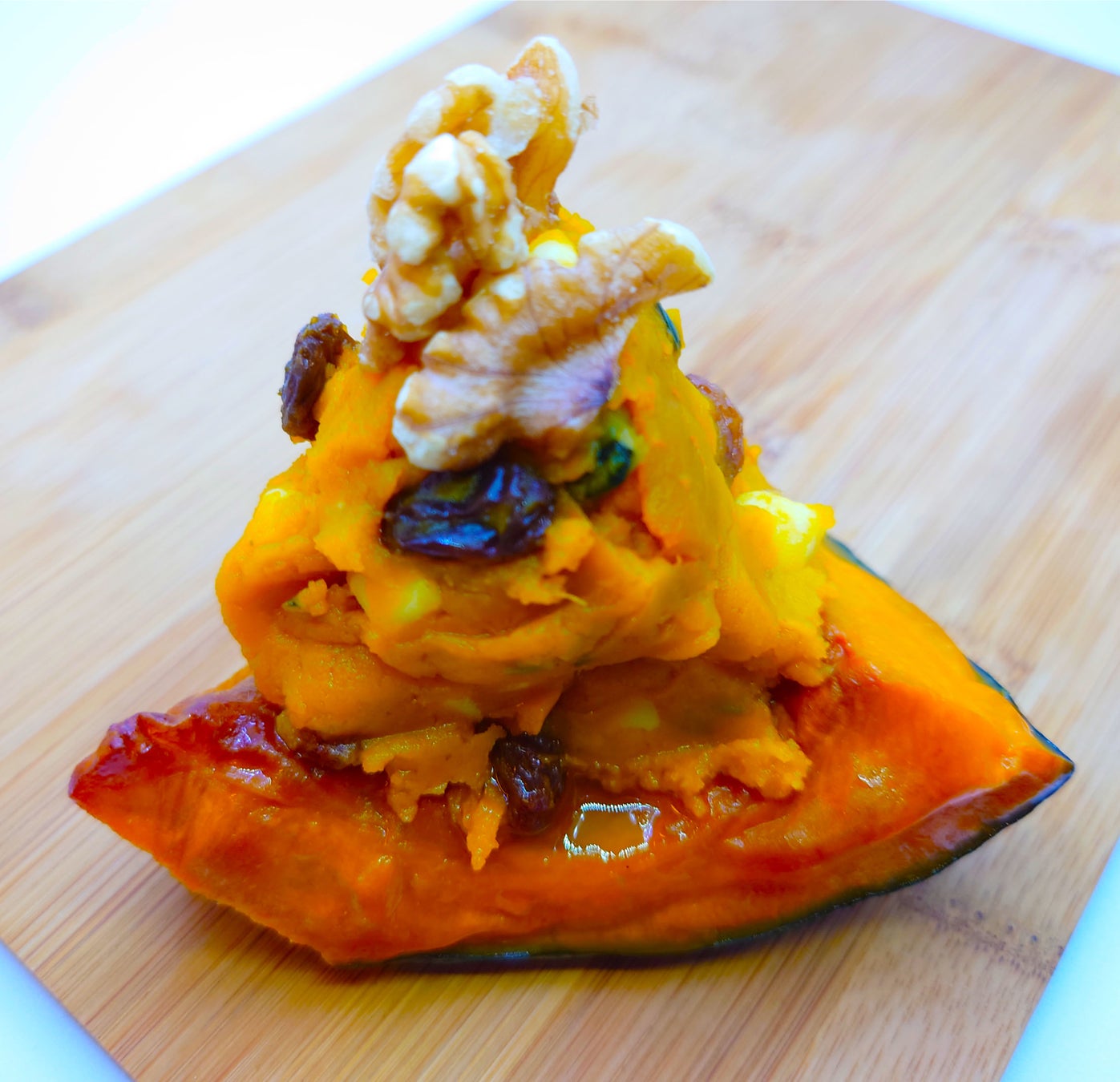 ほんのりカレー風味でスパイシーな香りと大豆チーズとレーズンで濃厚な味わいに仕立てた、皮まで美味しく食べられるカボチャのサラダ。ガラムマサラとカレー粉が食欲を刺激します。