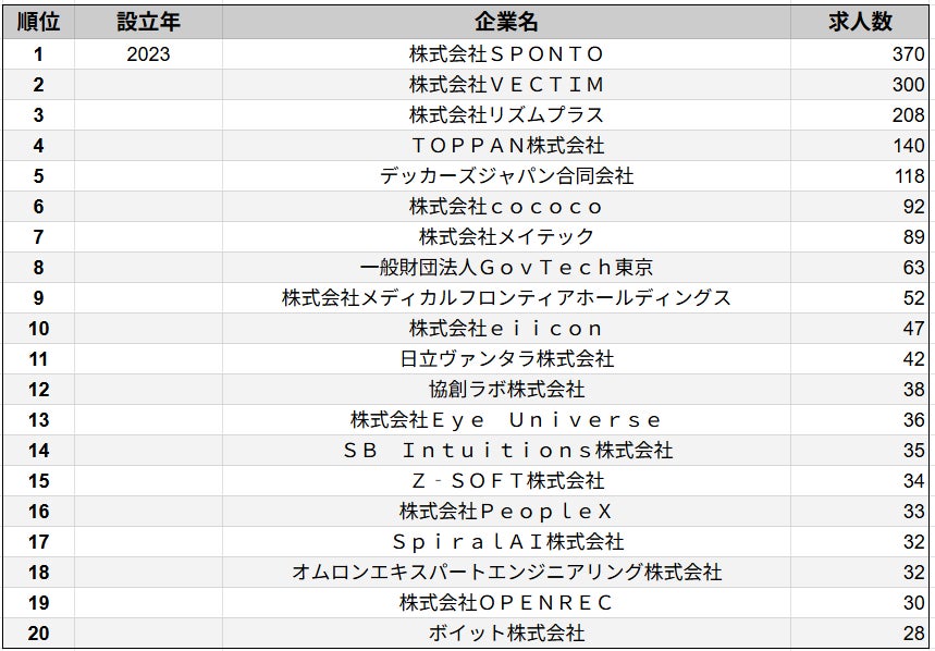 株式会社SalesNow(本社:東京都渋谷区、代表取締役:村岡功規、以下「当社」)は、国内540万社の企業情報を完全網羅した日本最大級のデータベース「SalesNow DB」より、2024年4月1日〜2025年4月1日の期間における求人データ(※アルバイト媒体を除く)をもとに、「2023年設立企業」における求人数ランキングTOP20を集計・発表いたしました。