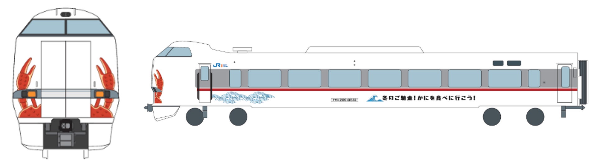 JR西日本では、株式会社日本旅行と連携して発売している「かにカニ日帰りエクスプレス(往復JR特急指定席+かに料理のセット)」のご利用開始に合わせて、かにをデザインした特急ラッピング列車を運行します。ぜひこの冬は、列車に乗って冬のご馳走「かに」を食べに魅力あふれる北近畿へお越しください。