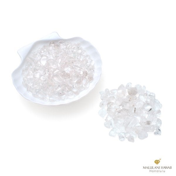 希少なヒマラヤ水晶のチップと、全てを清める水晶のチップ、美と幸運を象徴するシェルプレートのセット。