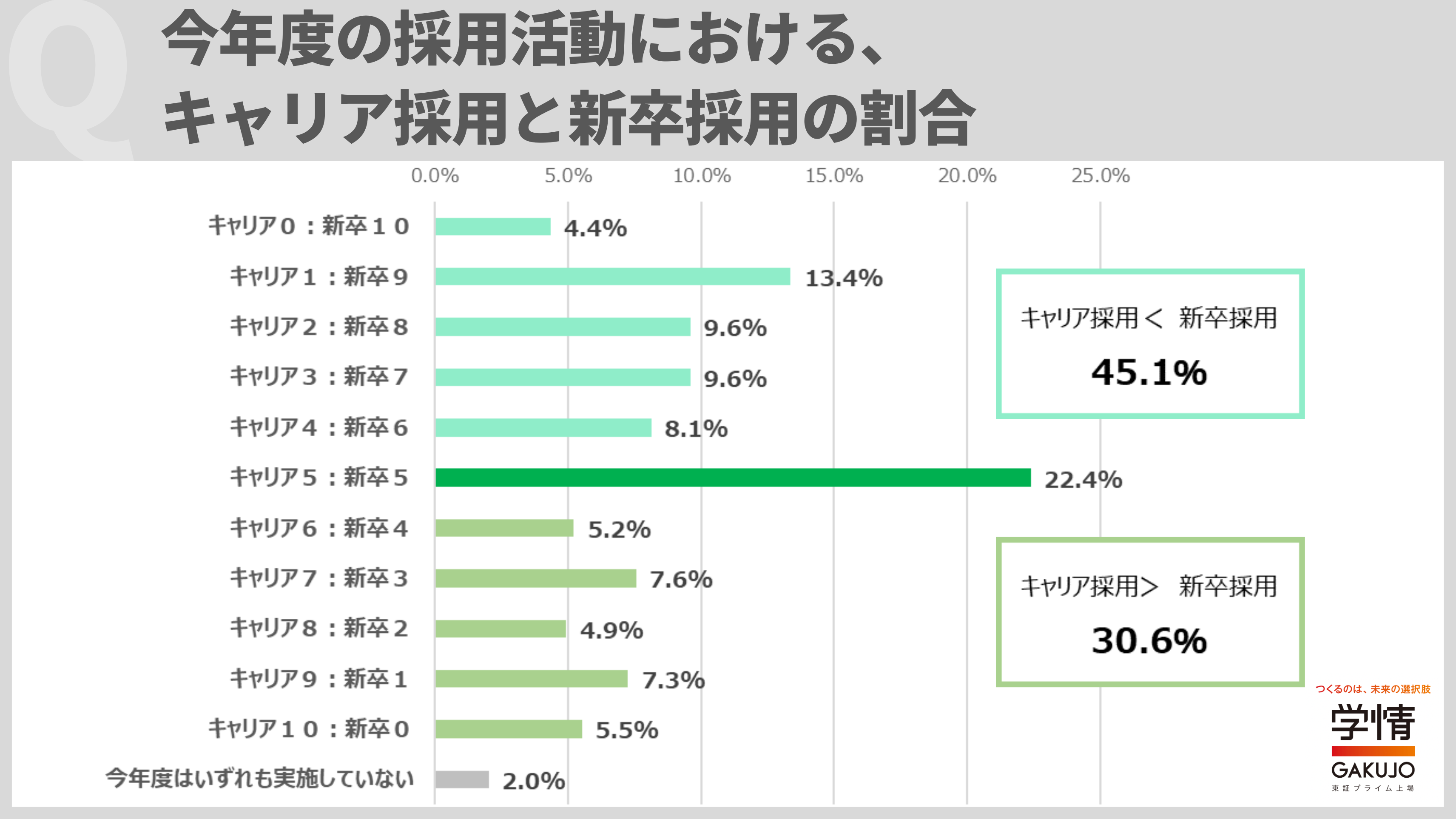 今年度の採用活動における、キャリア採用と新卒採用の割合は、「5:5」が22.4%で最多となりました。5社に1社は、キャリア採用と新卒採用を同割合で計画していることが分かります。「キャリア採用より、新卒採用の割合が多い」と回答した企業は45.1%、「キャリア採用のほうが、新卒採用より割合が多い」と回答した企業が30.6%となりました。