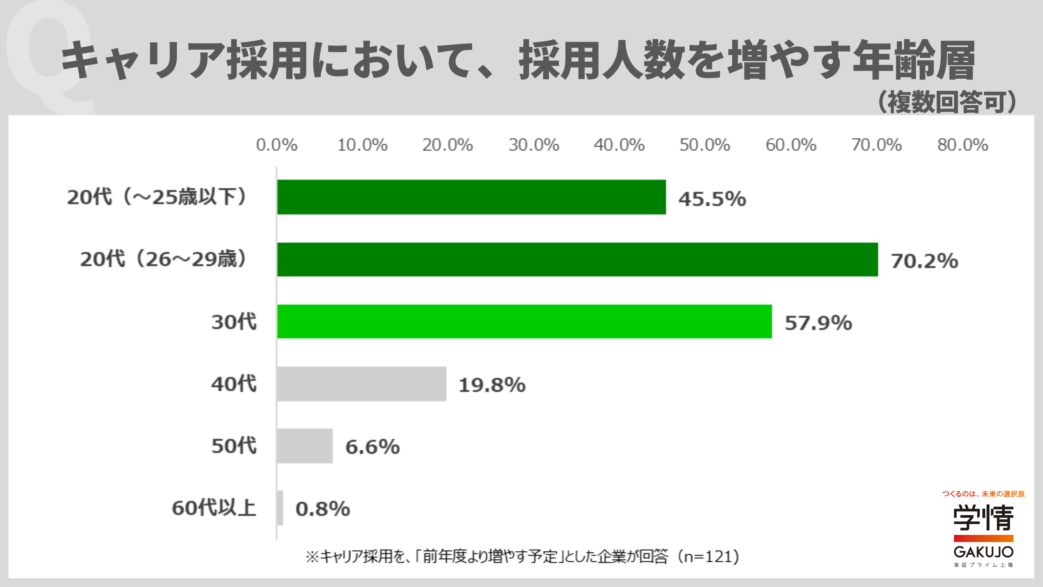 キャリア採用において、採用人数を増やす年齢層は、「20代(26~29歳)」が70.2%で最多となりました。次いで、「30代」57.9%、「20代(~25歳以下)」45.5%と続きます。20代を中心に、若い世代の採用を増やしたいという意向がうかがえます。