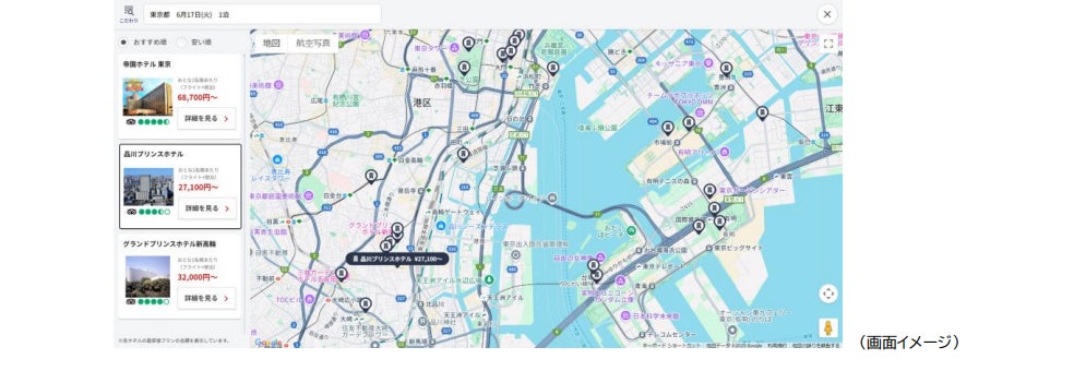 国内航空券+宿泊の基本旅行代金と合わせて、Google Map上より宿泊施設を検索できるようになりました。