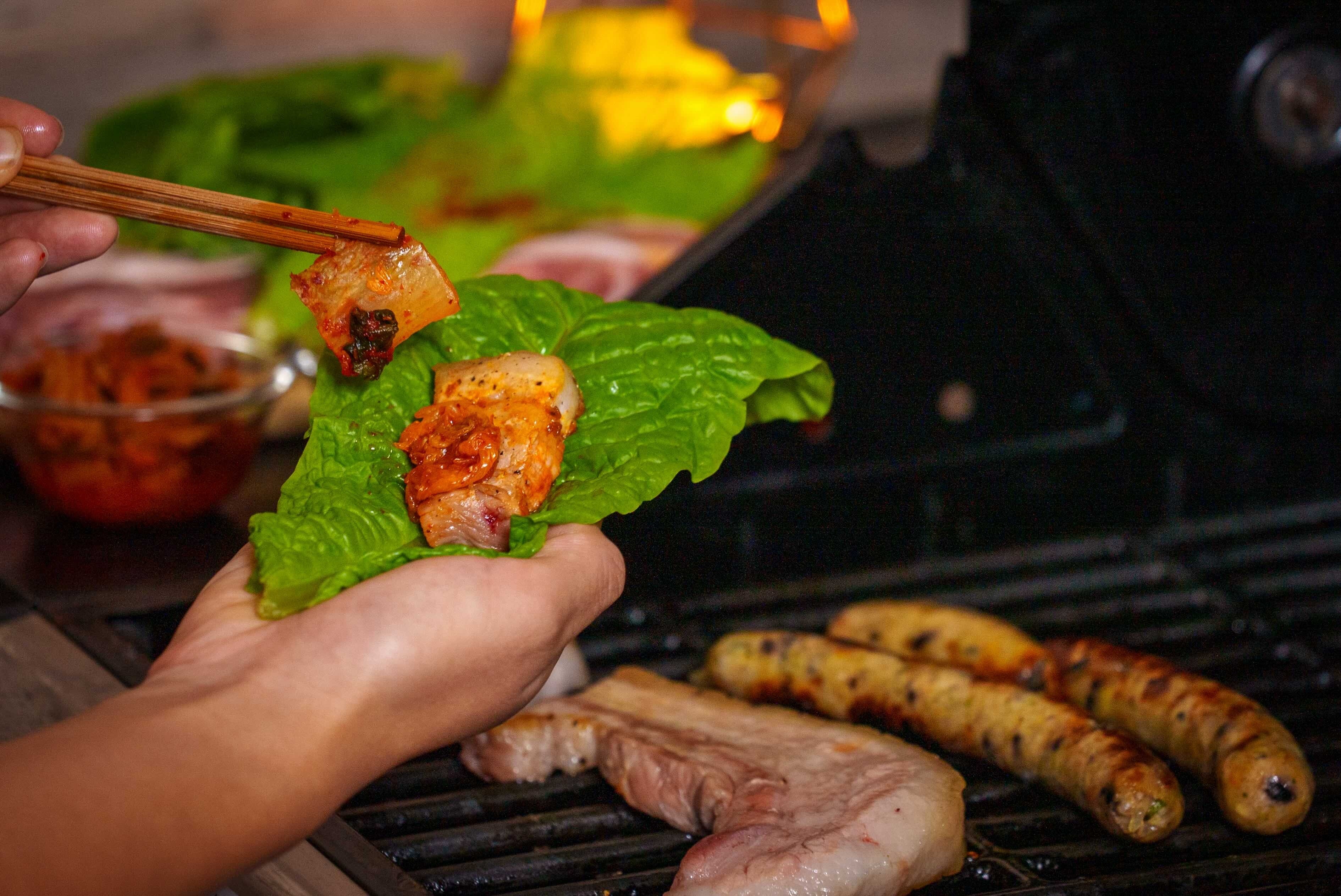 分厚い豚バラ肉をお好みの4種の薬味(キムチ、辛味噌、スイートチリソース、ごま油)と一緒にサンチュに包んでお楽しみください。