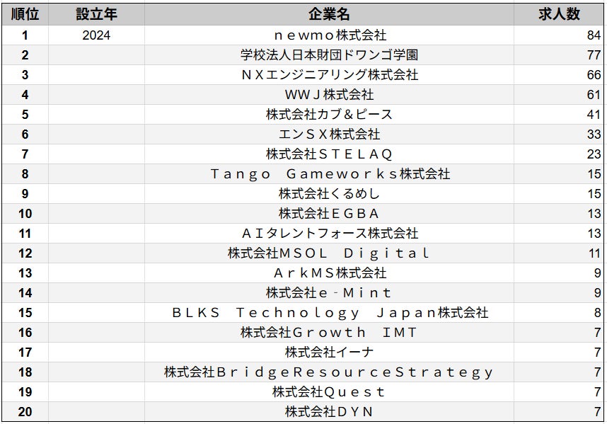 株式会社SalesNow(本社:東京都渋谷区、代表取締役:村岡功規、以下「当社」)は、国内540万社の企業情報を完全網羅した日本最大級のデータベース「SalesNow DB」より、2024年4月1日〜2025年4月1日の期間における求人データ(※アルバイト媒体を除く)をもとに、「2024年設立企業」における求人数ランキングTOP20を集計・発表いたしました。