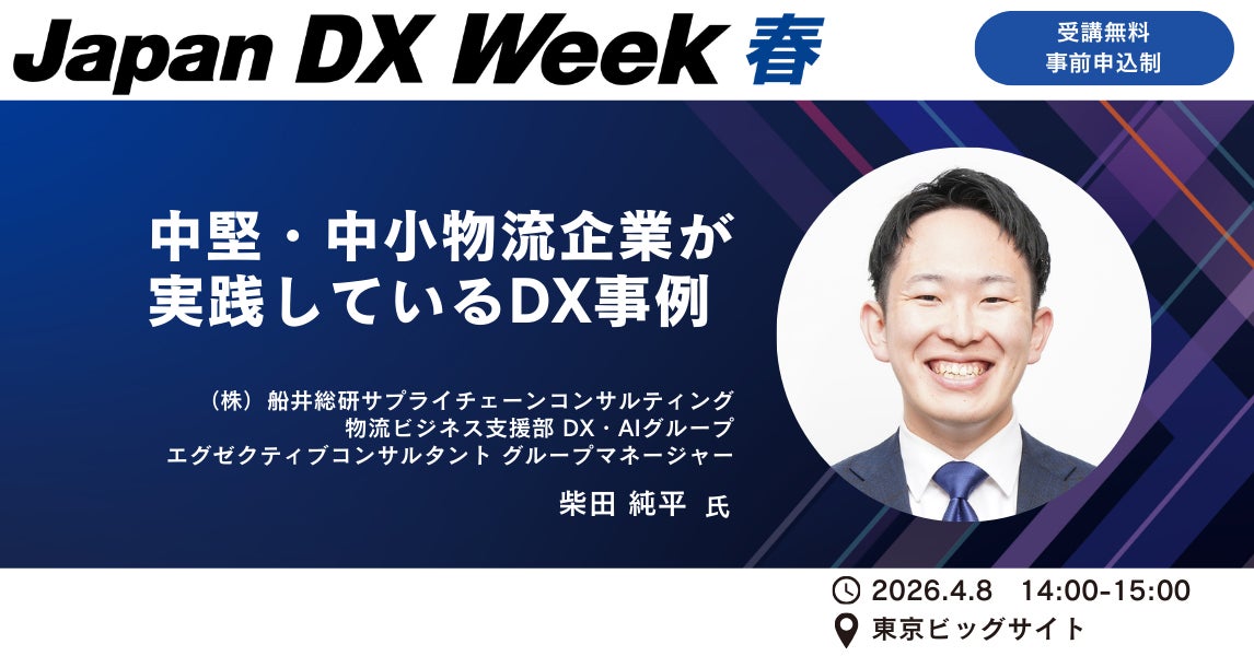 株式会社船井総研サプライチェーンコンサルティング(本社:東京都中央区、代表:橋本直行、以下「船井総研SC」)は、2026年4月8日(水)に開催された日本最大級のIT展示会「Japan IT Week [春] 2026」のカンファレンスに、エグゼクティブコンサルタントの柴田純平が登壇したことをお知らせいたします。