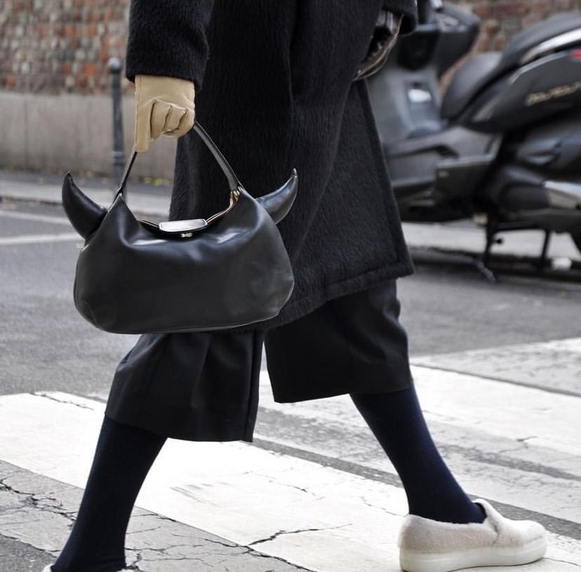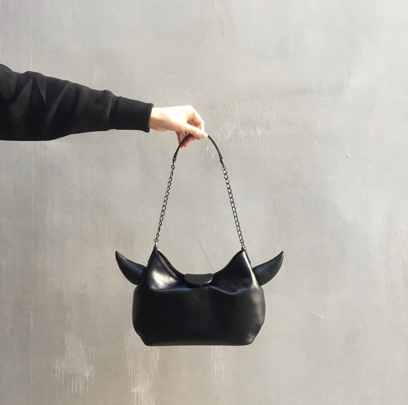 ヒロコ ハヤシのアーカイブから復刻したレザーバッグ。牛革に角が生えたデザインには「バッグを味方につけて、背筋を伸ばして歩いて欲しい」という思いが込められています。