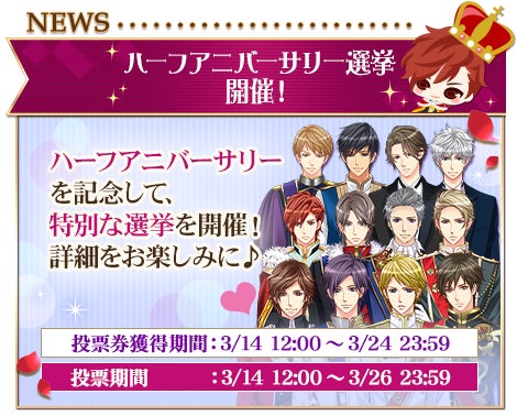 これを記念して、これまで支えてくださったファンの皆様へ感謝を込めたハーフアニバーサリー記念企画の実施が決定しました。特別な内容でお届けするキャラクター選挙や、限定イラストや特典が手に入るログインボーナス、さらにはお得なアイテムセットの販売や新シリーズのガチャなど、お楽しみいただける企画をたくさんご用意しておりますので、この機会にぜひ王子様EK6.5周年企画をお楽しみください。