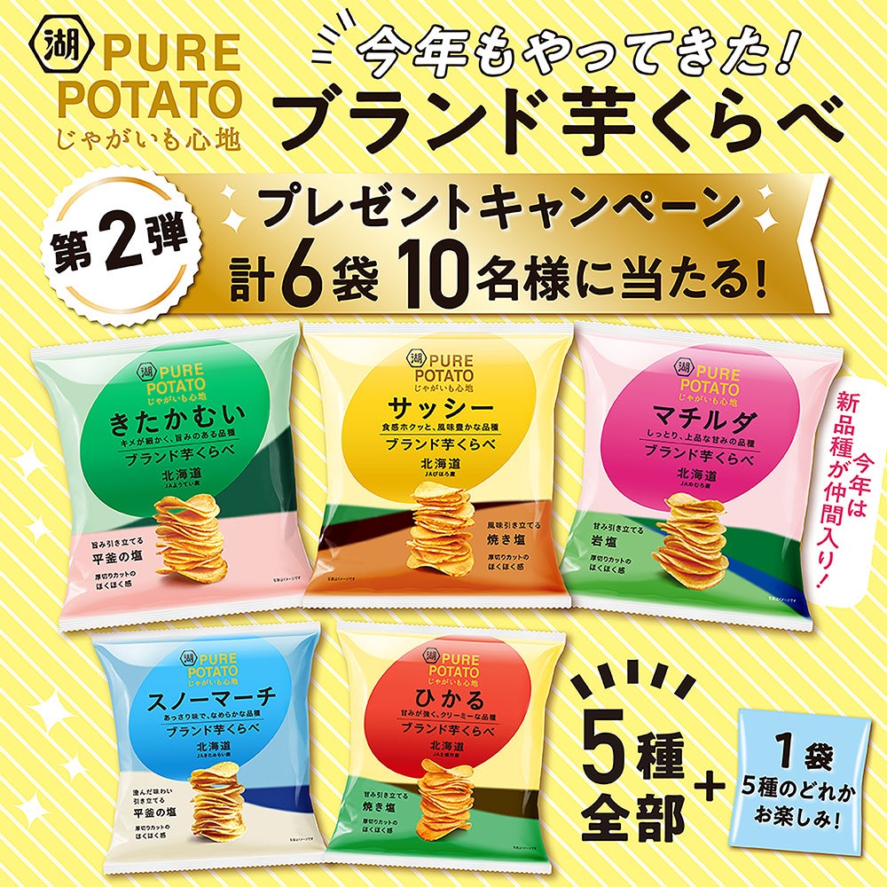 株式会社湖池屋(本社:板橋区/社長:佐藤章)は、じゃがいもの濃い味わいと特有のホクホク感がご好評をいただいている「PURE POTATO じゃがいも心地」ブランドより、北海道の誇る“ブランド芋”を使用した「じゃがいも心地 ブランド芋くらべ」シリーズの第2弾を2022年11月7日(月)に発売することを記念し、ブランド芋くらべシリーズ全5品の詰め合わせが当たる『今年もやってきた! じゃがいも心地 ブランド芋くらべ プレゼントキャンペーン 第2弾』を実施します。