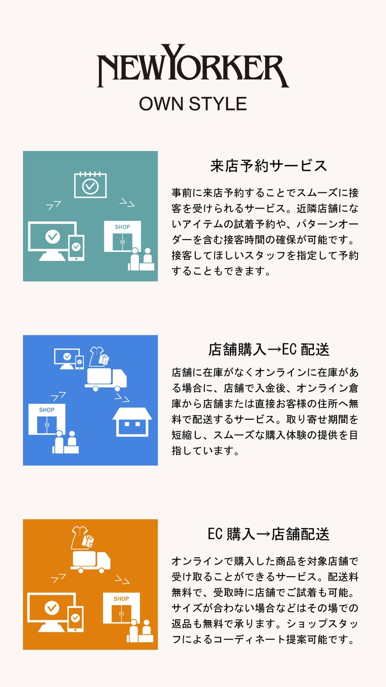 また、『NEWYORKER OWN STYLE』コレド日本橋店では、お買い物に便利の3つのサービスを実施しております。