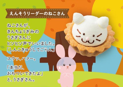 「いぬねこ楽団の音楽会」の物語を1枚の絵本風リーフレットにしました。お話とプチケーキがページごとに載っており、みんなで物語を読みながらプチケーキをお楽しみいただけます。ストーリーや挿絵などの制作すべて当社社員が手掛けています。