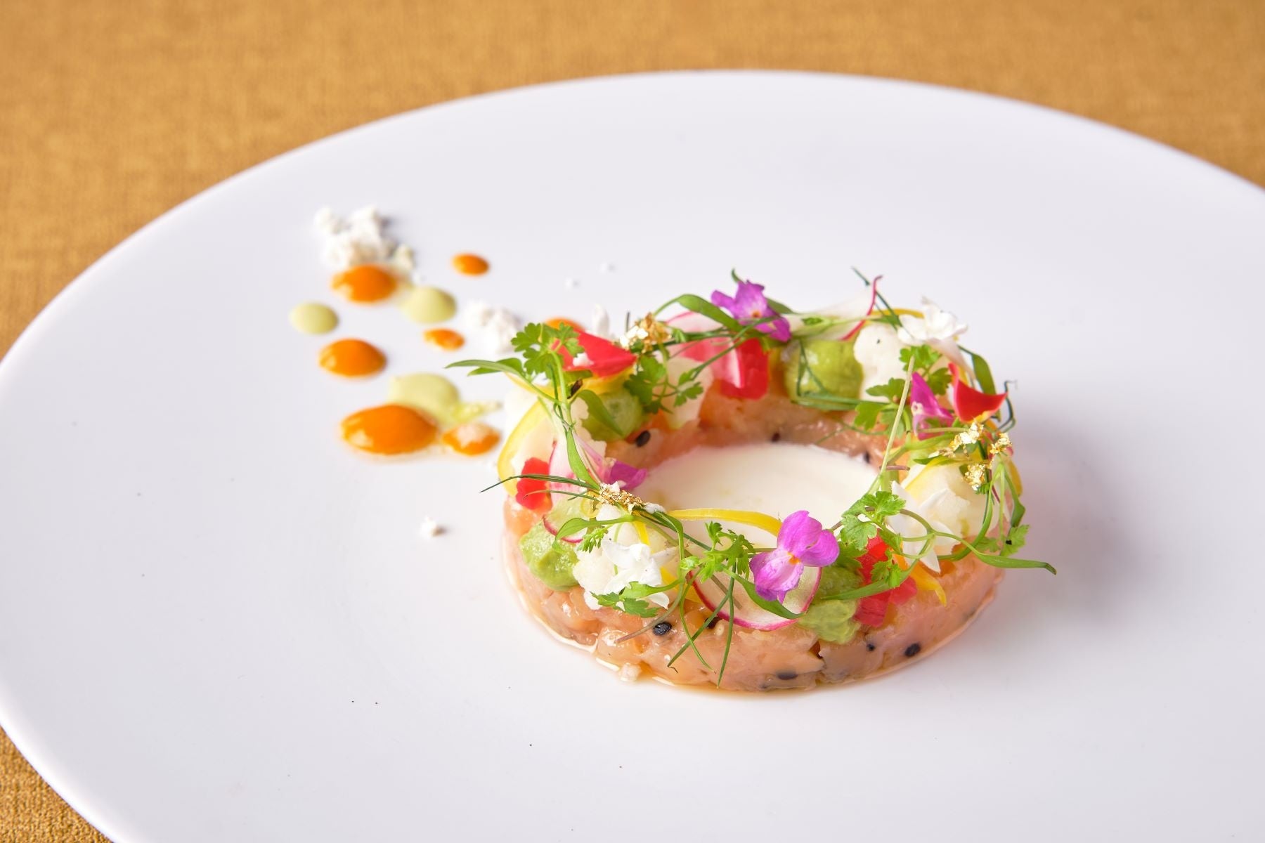 〈冷前菜〉 富士の介のマリネとアボカド、彩りグレック野菜のクリスマスリース仕立て フロマージュブランの酸味を添えて レモンオイルとシーバックソーンのアクセント