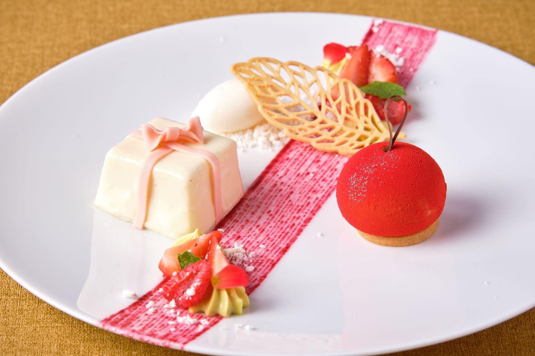 〈デザート〉 ピスタチオとベリーのムース チーズケーキのプレゼント仕立て ミルクアイスを添えて