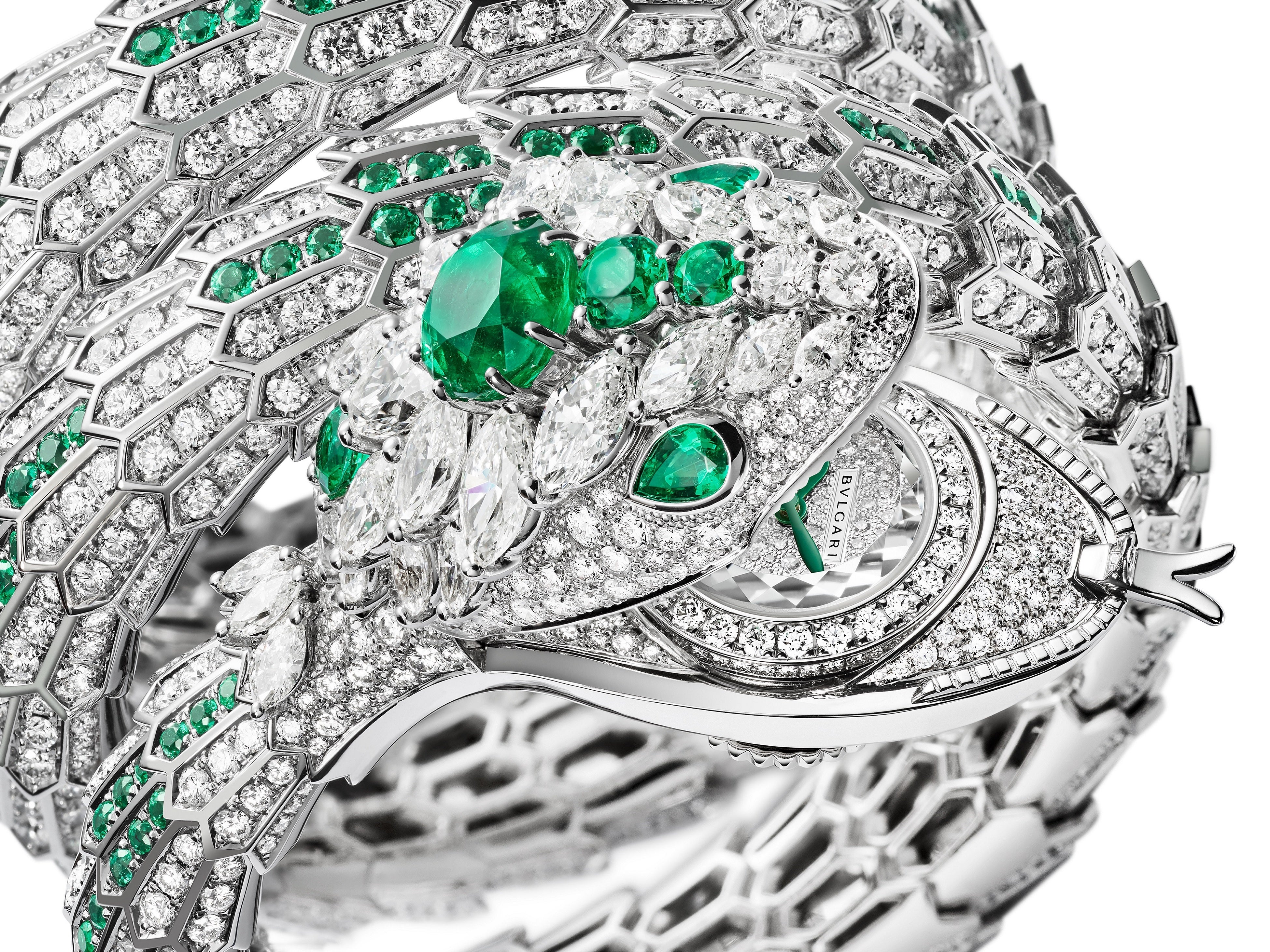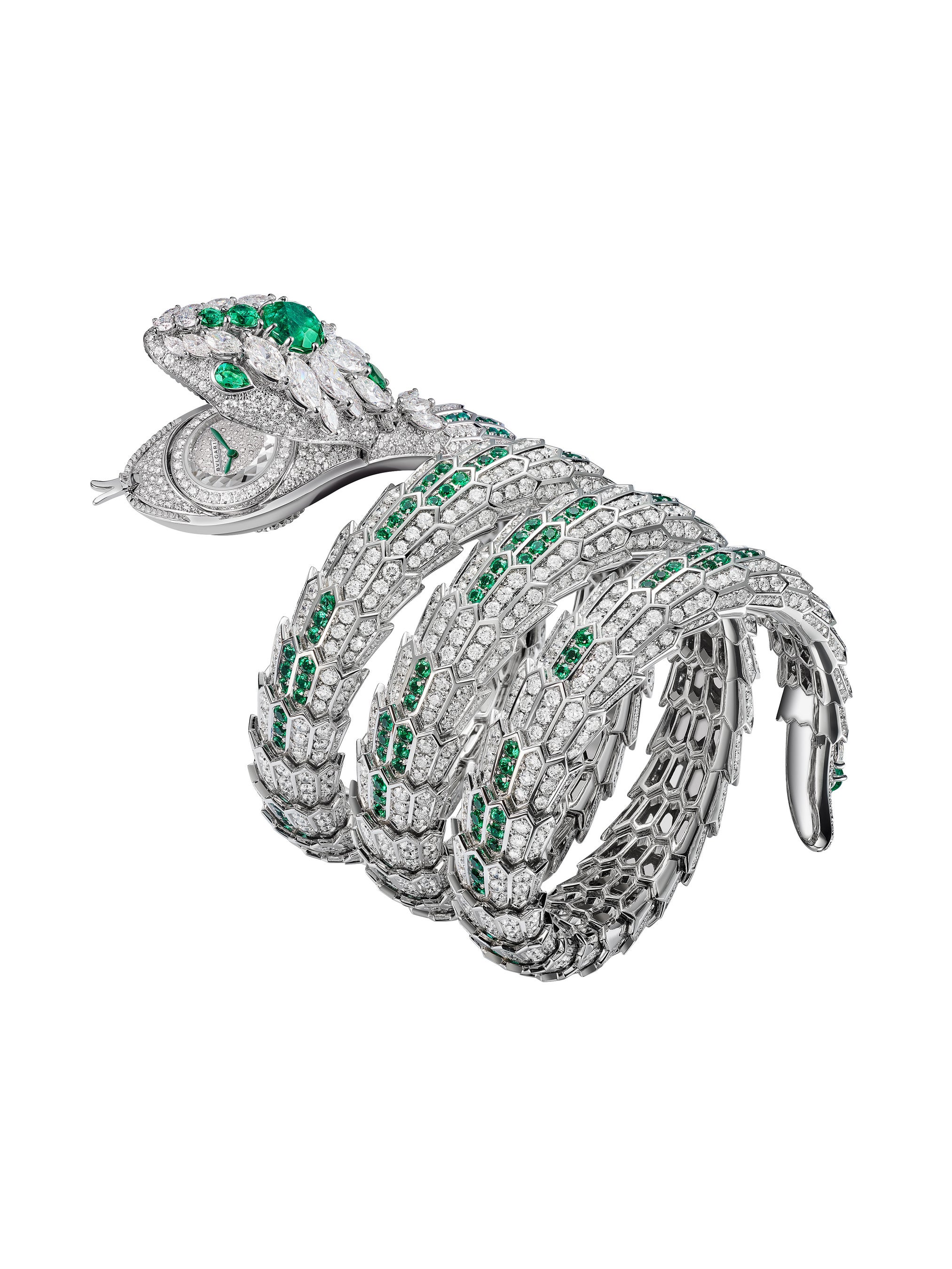 ジョーゼフ・L・マンキーウィッツの映画「クレオパトラ」でエリザベス・テイラーが主演を務めた際にブルガリがデザインしたセルペンティ ウォッチに着想を得た「セルペンティ ミステリオーシ ドラゴーネ」。ホワイトゴールド製のドラゴンのヘッドはダイヤモンドで飾られ、2石の美しいエメラルドの瞳がはめこまれています。3連の ホワイトゴールドのブレスレットにはラウンドブリリアントカットダイヤモンドとエメラルドが余すところなく散りばめられ、希少なタイムピースを完成させるとともに、他の追随を許さないほどに心地よいフィット感を叶えています。ブルガリのすべてのピースに共通する遊び心が感じられるドラゴンのヘッドは、小さな舌を押すとケースが開き中からダイヤルが現れます。ヘリテージピースと同様、左右どちらの手首にも纏えるようダイヤルの向きは簡単に変えられる仕組みになっています。ブルガリが誇る最小の機械式ムーブメントが搭載されています。
