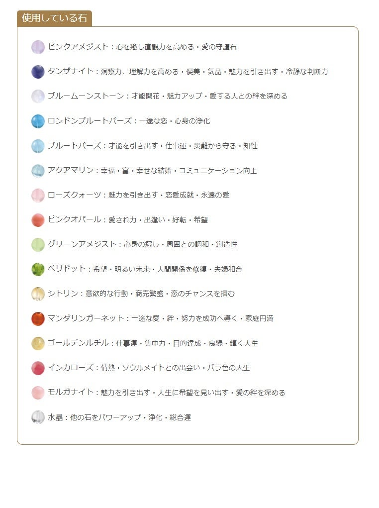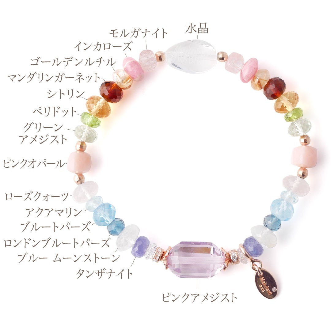 恋愛、金運、健康、開運など、天然石を持つ際に心に願う祈りを、様々なストーンに託したブレスレットは、ブルームーンストーン、タンザナイト、ロンドンブルートパーズなど、レアストーンも贅沢に配置。