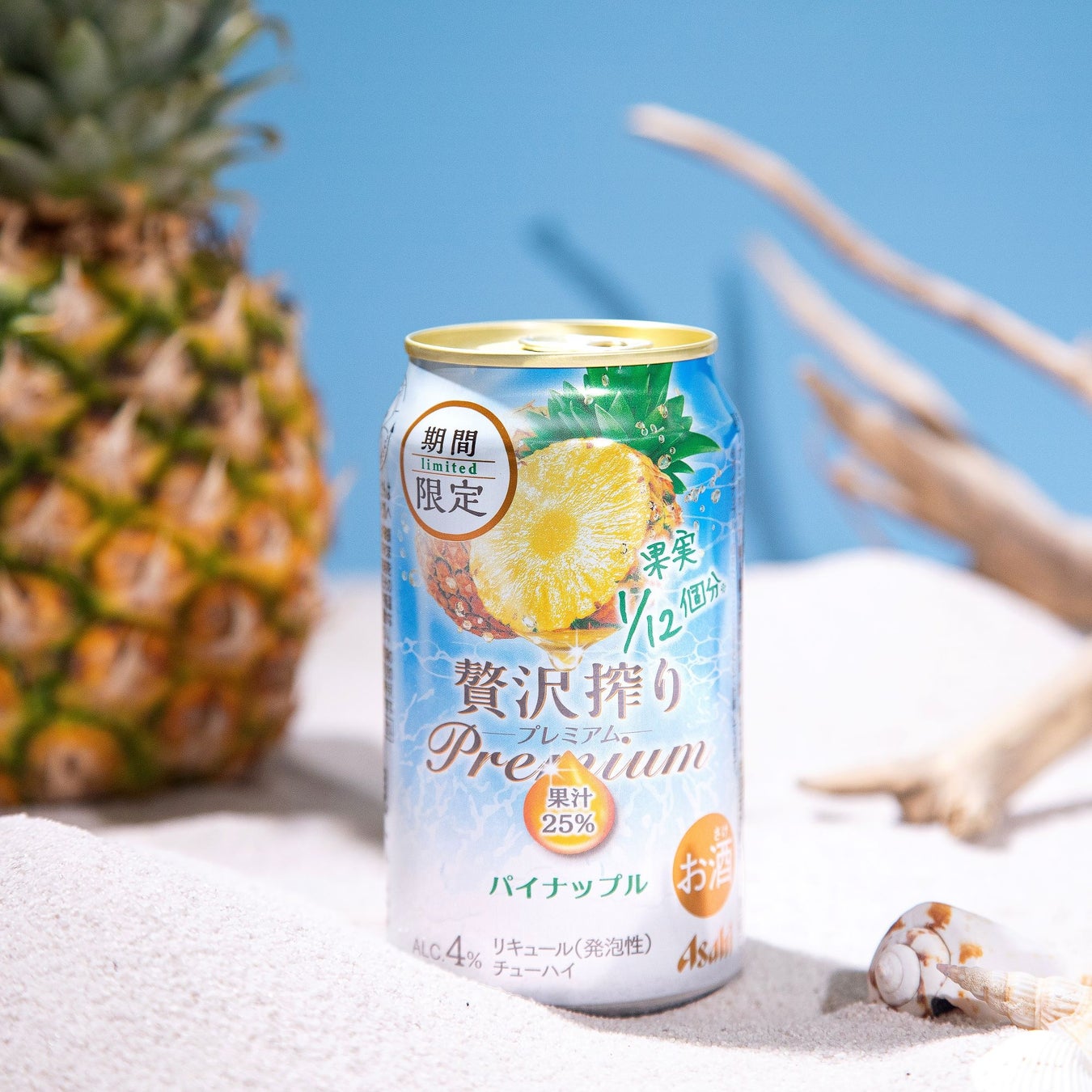 『アサヒ贅沢搾りプレミアム期間限定パイナップル』は、パイナップル果実1/12個分を使用した果汁25%の缶チューハイです。独自配合のパイナップルリキュールを使用することで、パイナップル本来の芳醇な香りとみずみずしい味わいが楽しめます。パッケージは、パイナップルの大きなイラストで商品特長を分かりやすく訴求し、真夏の海のさざ波を背景に描くことで季節感を演出しています。
