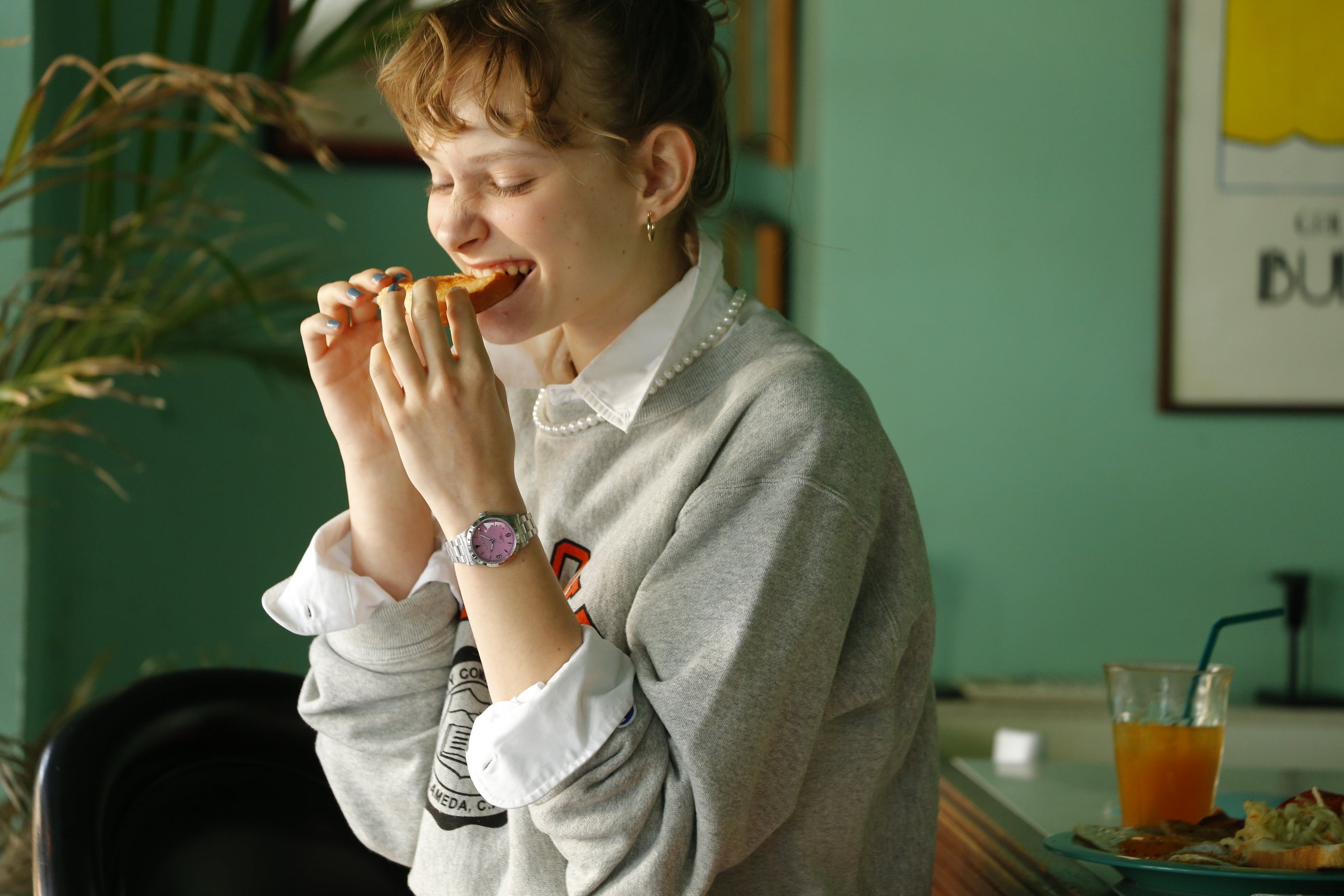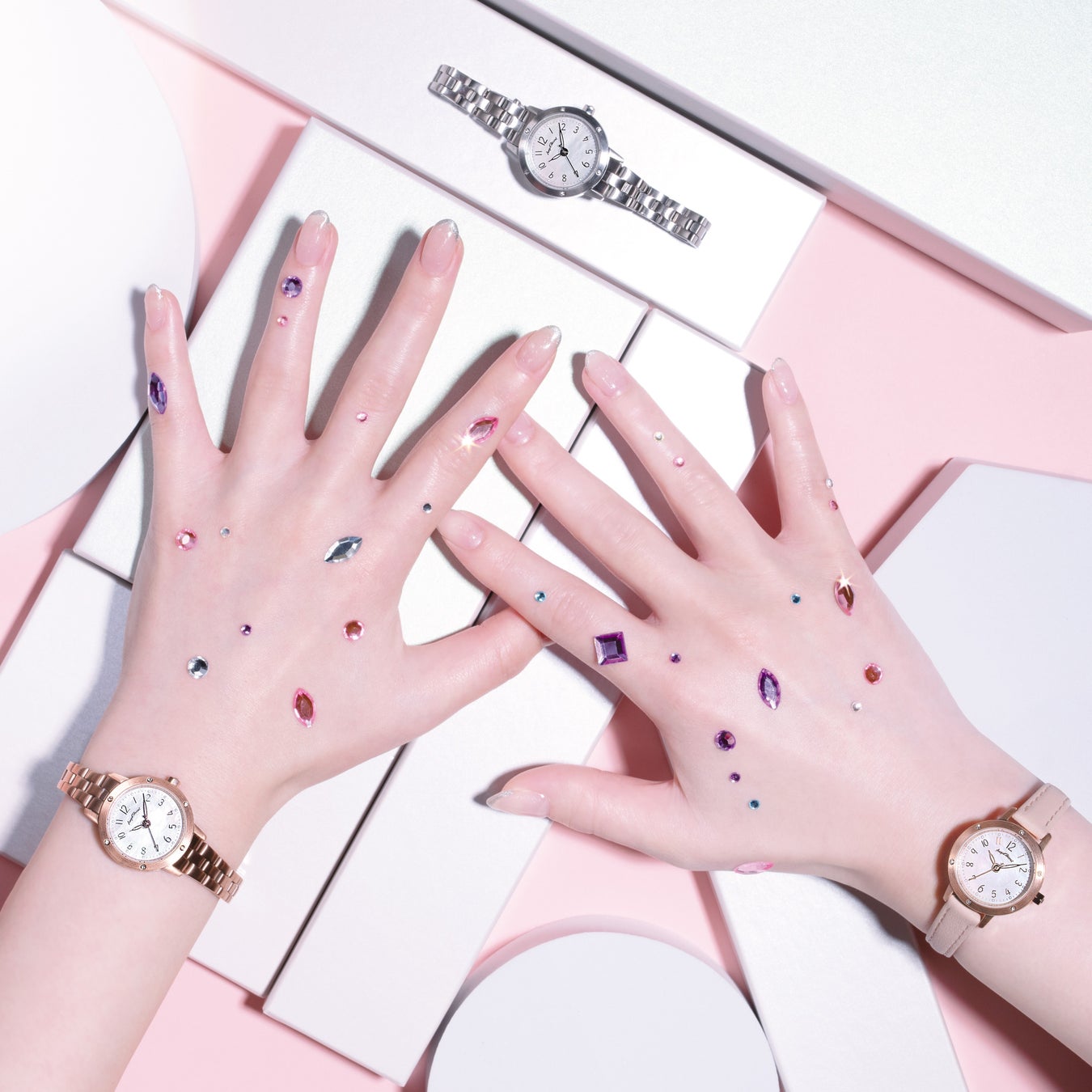 高級感溢れるメタルバンドや、クラシックな雰囲気のブラックレザーベルトにクルーエルピンクを合わせることで抜け感のあるレディなお洒落な手元を演出。