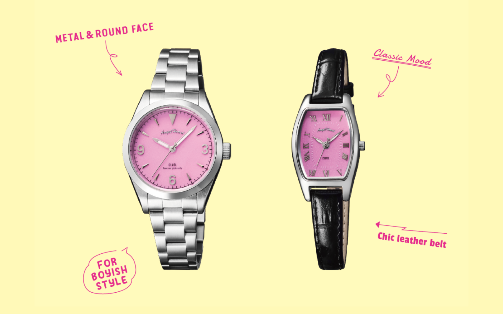 どちらもエンジェルハートらしいデザインとガーリーさはそのままに、クルーエルのキーカラーである<クルーエルピンク>を文字盤に落とし込みました。