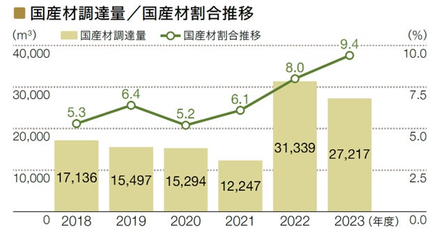 「木材利用推進コンクール・国産材利用推進部門」は、持続的な森林経営が行われている森林から産出される国産材の大量かつ持続的な利用とともに、国産材利用の意義、メリットや効果等についての普及啓発等国産材利用の拡大に向けた積極的な取り組みを行っているかなどが評価され、国産材の利用推進に関して特に優れた点が認められる企業が選定されます。
