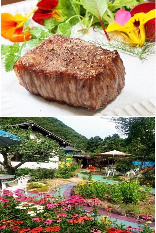 上郡町内産の上質な黒毛和牛を遠赤効果の高い手造りセラミックス窯で焼き上げ、外はこんがり中はジューシーに仕上げた、肉本来の味が堪能できる極上のステーキコースを提供。一年を通して花いっぱいで埋め尽くされる庭園は、オーナーの手造り。ゆったりとした時間を過ごすことが出来る特別な空間で食事を楽しめます。