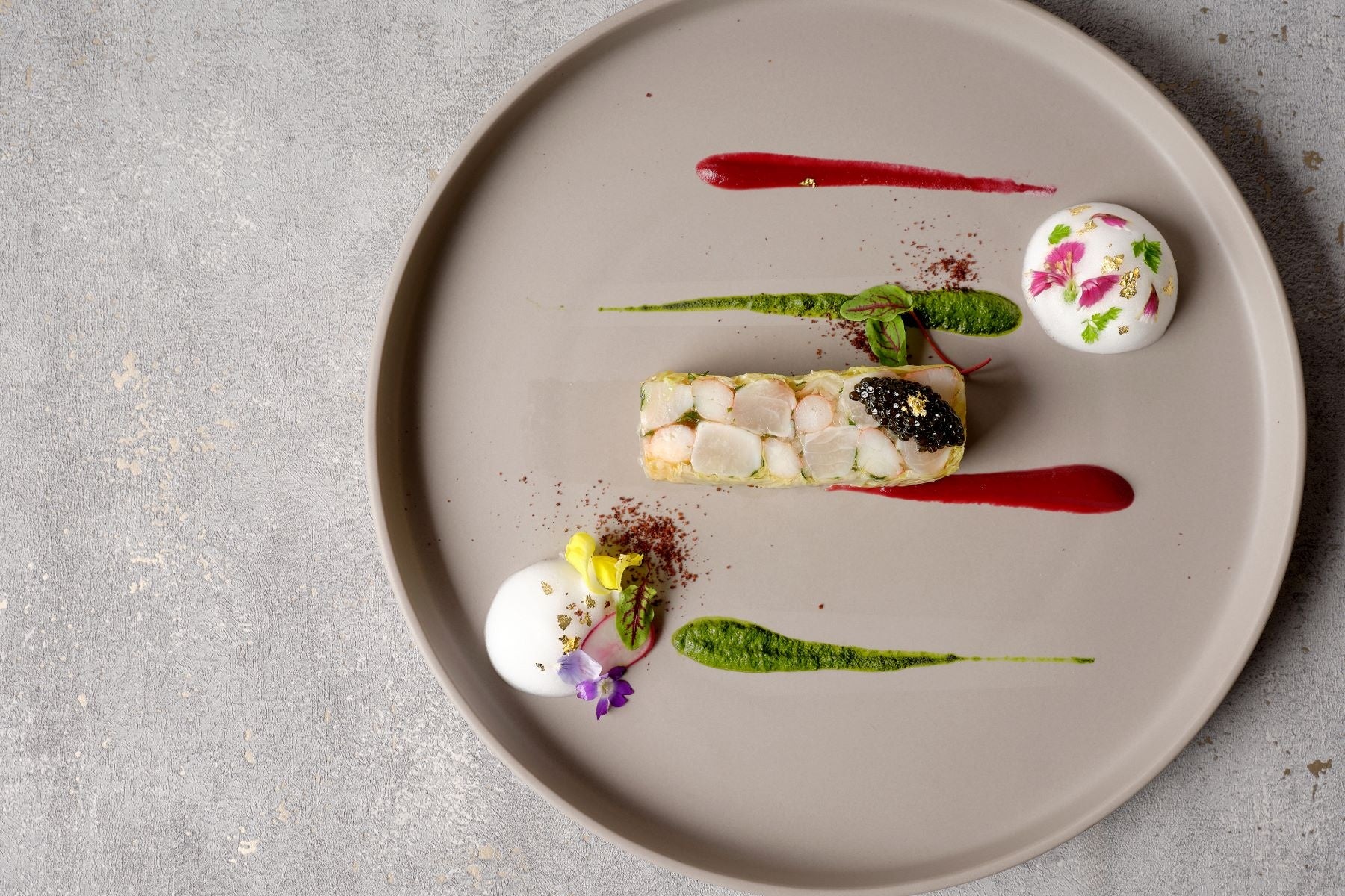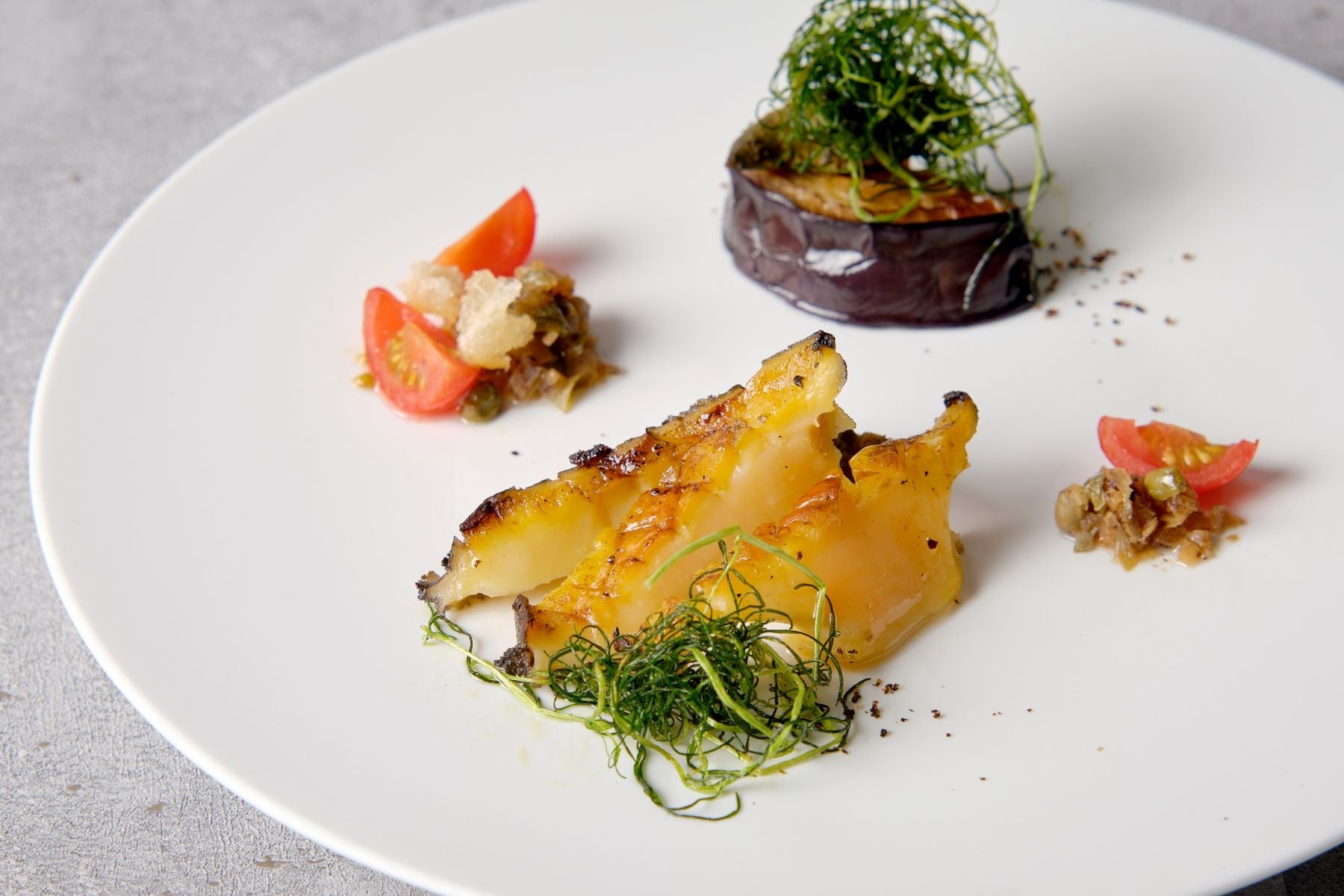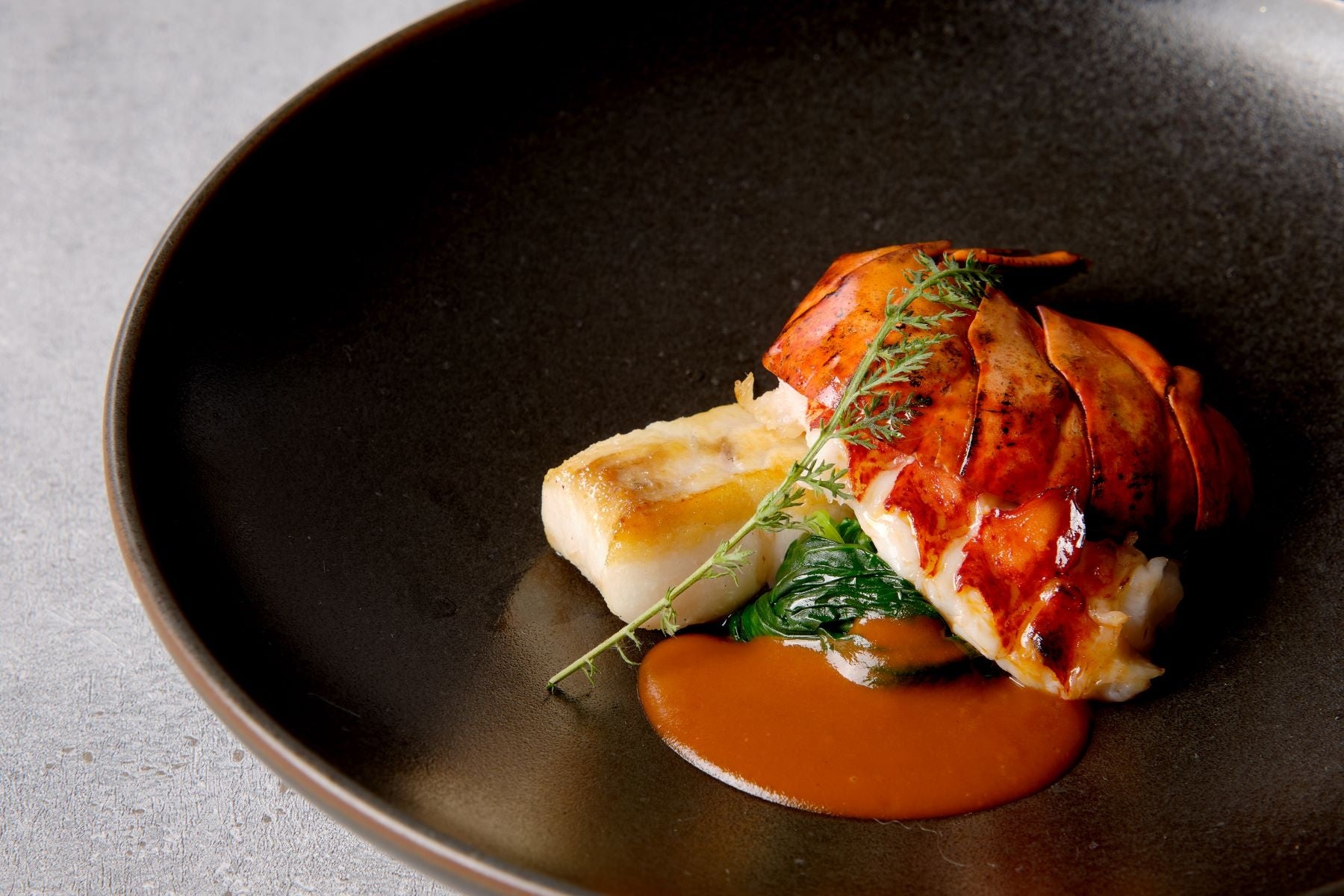 オマール海老と寒平目のサルタート 甲殻類のソースと黒レモンのアクセント