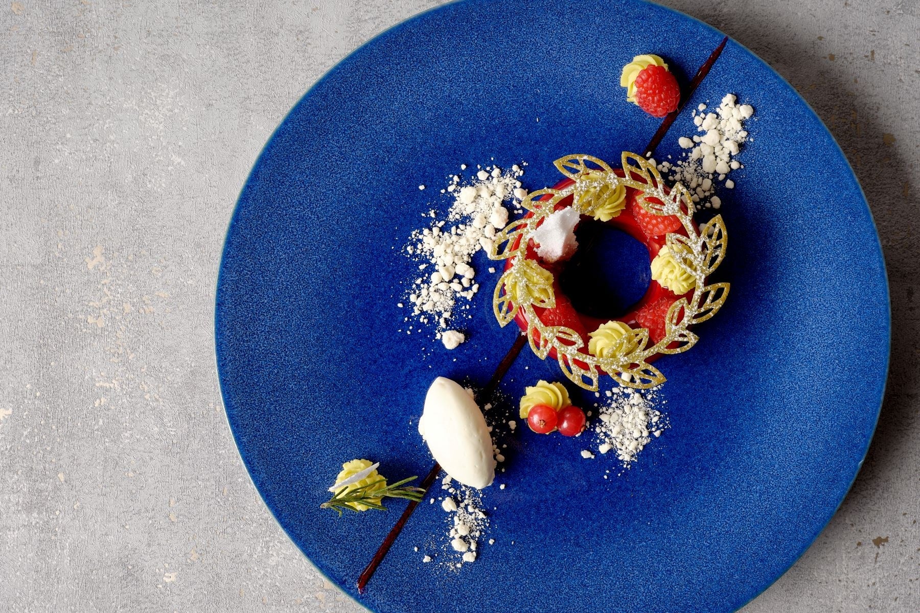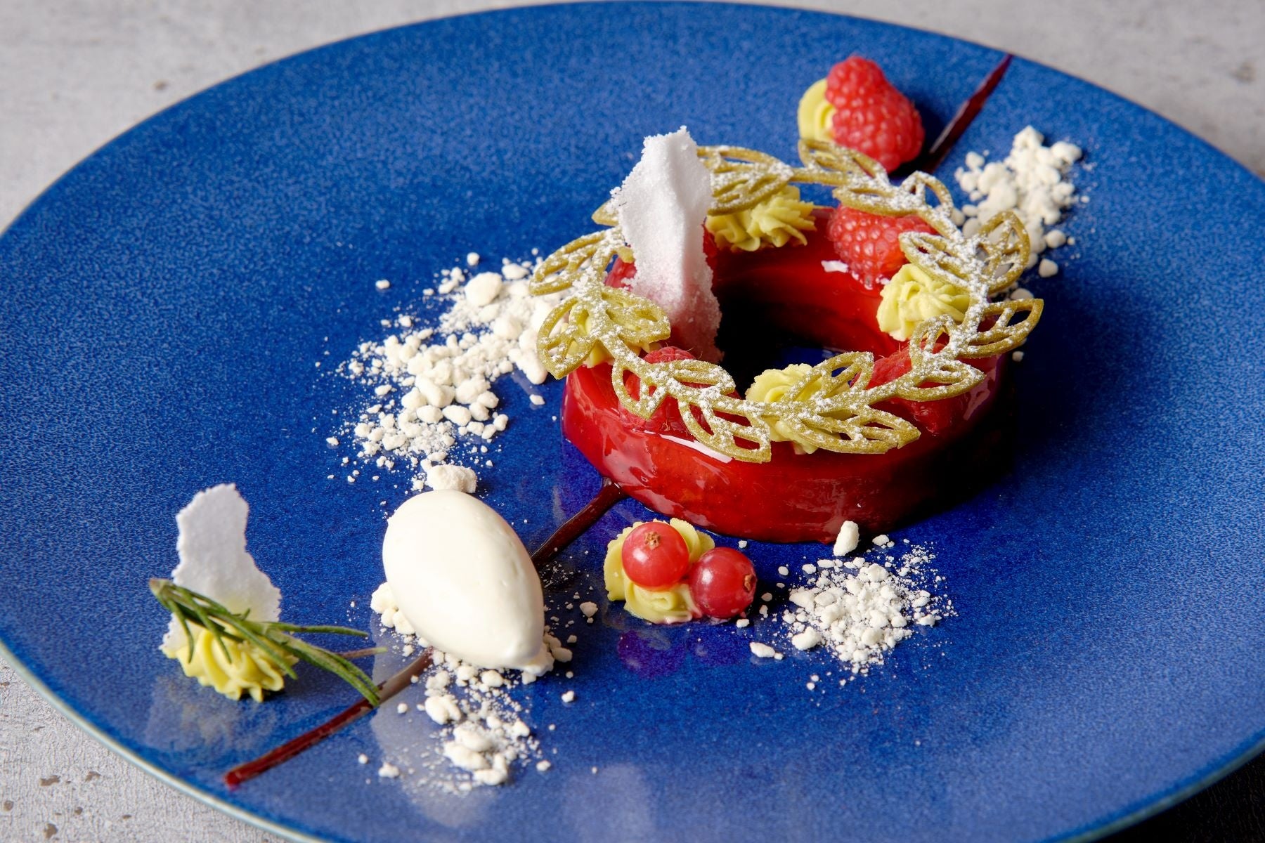 そしてコースの最後を彩るアートのようなデザートのクリスマスリースに見立てたムースリーヌは、艶やかに煌めくベリーの酸味と、ビターショコラの芳醇で深みのある苦みが溶け合い、バランスよく調和することで、最後まで洗練されたマリアージュを楽しむことができます。