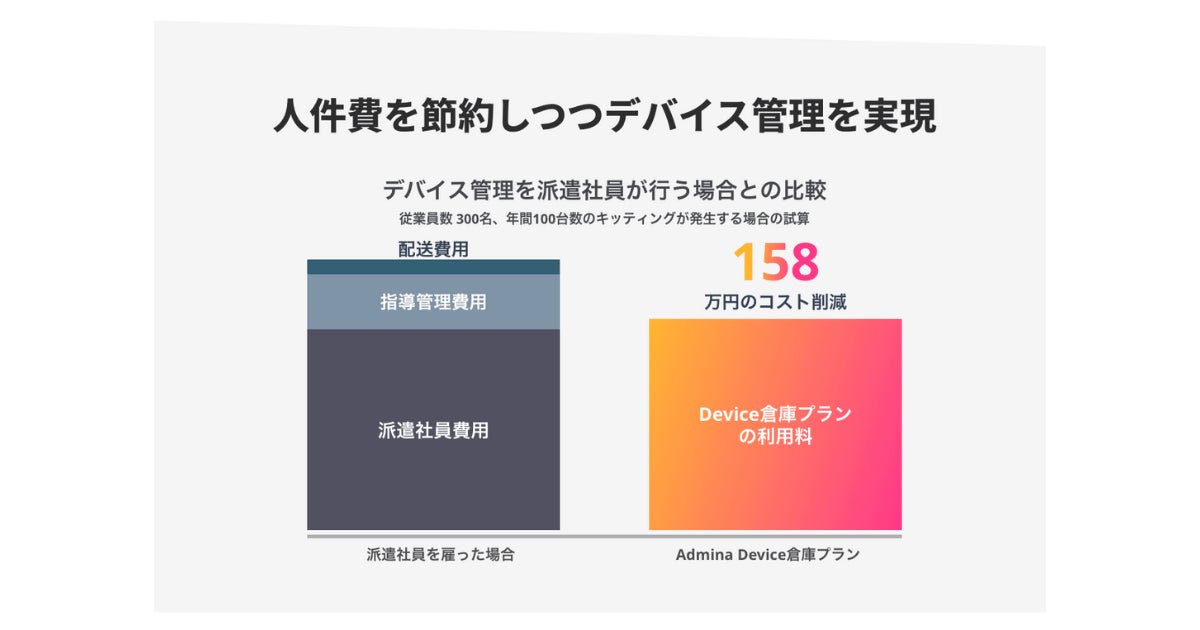 入社に伴って管理端末台数が増える年度初めや、テレワークのメンバーへの自宅配送を行う場合も、送料が含まれた年額内で利用できます。新たに人員を雇用したり、同様のサービスを自社で構築するよりも、低いコストでご利用いただけます。